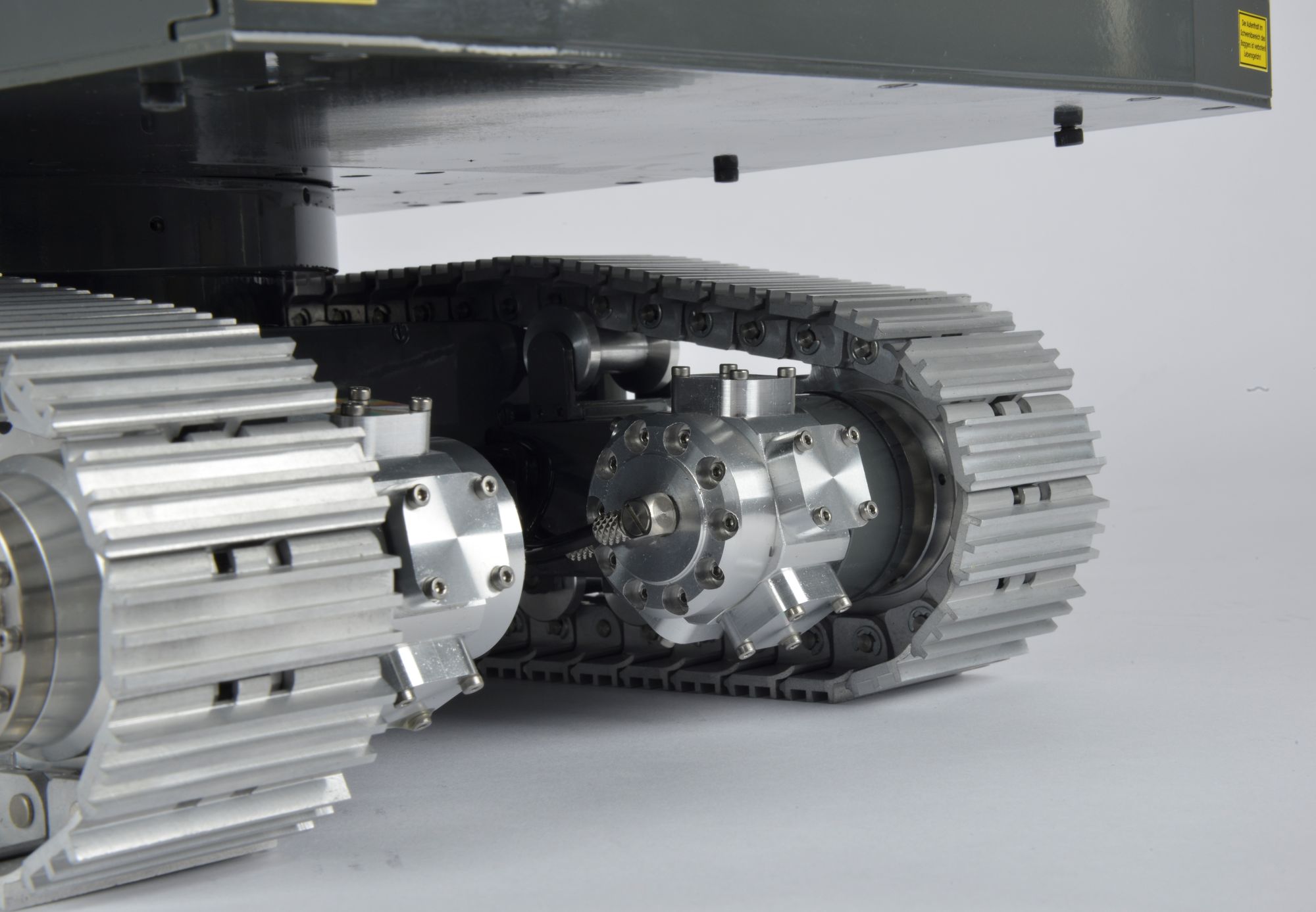 -Hydraulischer Fahrantrieb über zwei Hydraulikmotoren mit vorgeschaltetem Planetengetriebe (da ein Hydraulikmotor niedrige Drehzahlen hat, ca. 120 U/min, ist der Fahrantrieb relativ langsam). Faulhaber E-Motor für Hydraulikpumpe, für einen besonders leisen Lauf auf Schwinggummis montiert, Hydraulik-Öltank aus Metall.-Zwei Ketten bestehend aus 312 Teilen und Kettenspannern