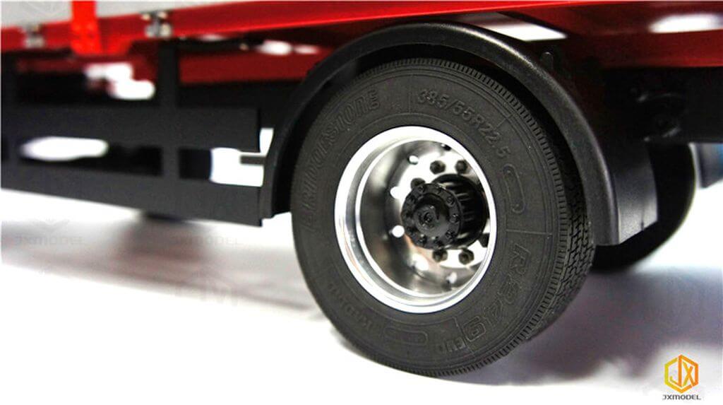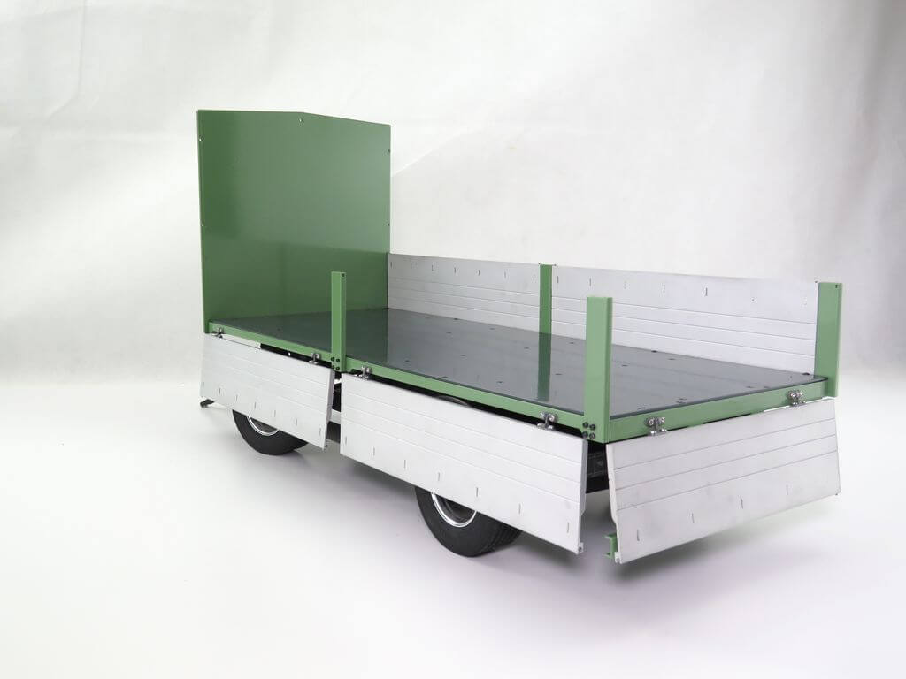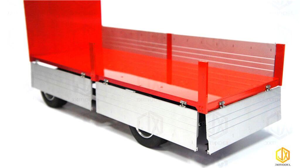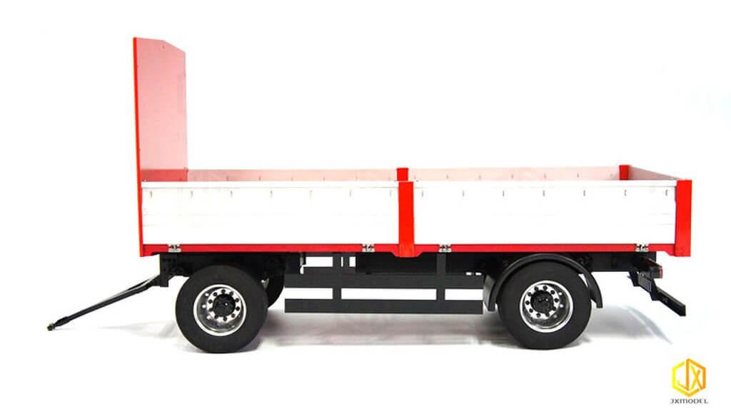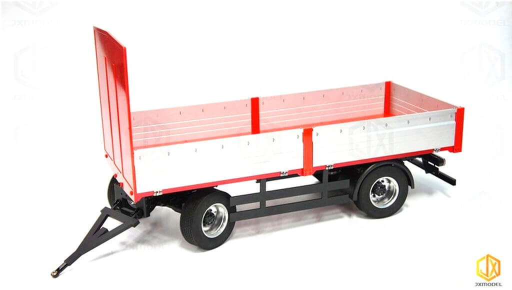 1:14 Anhänger 2-Achs mit Pritsche. Bausatz eines 2-Achs-Anhängers, mit Pritsche, aus Metall, unlackiert. Die Bordwände lassen sich öffnen. XJModel.