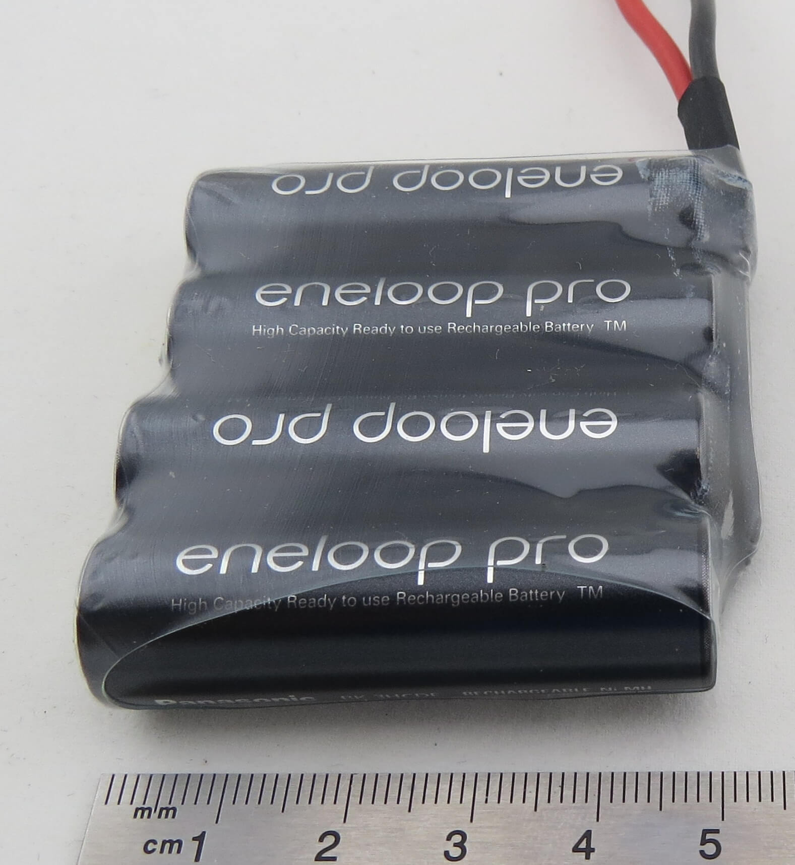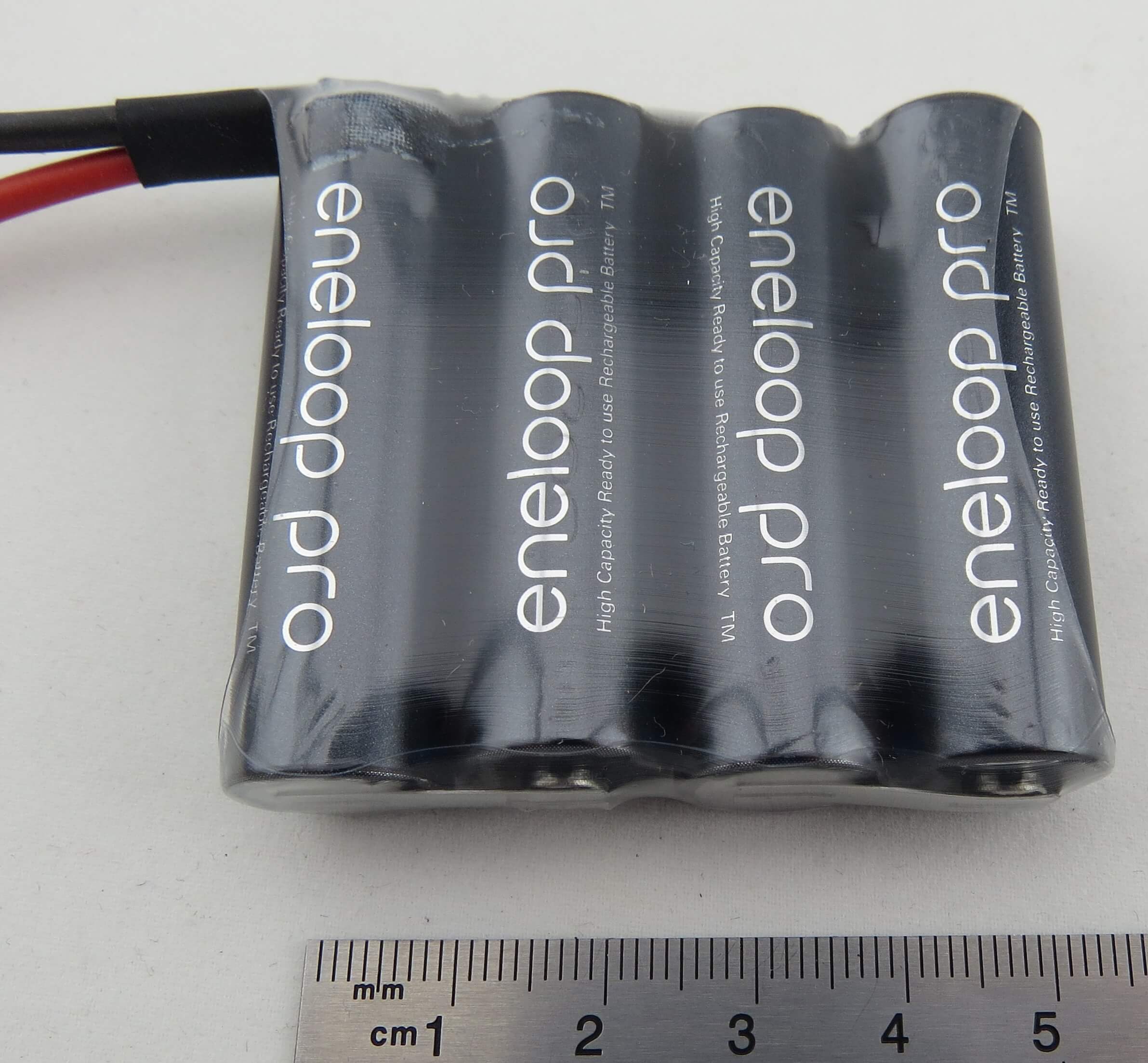 1 Akku-Pack mit 4x Sanyo ENELOOP PRO. 4 Zellen, 4,8V 2450mAh NiMH mit offenen Enden, je 12cm Silikon-Kabel 0,7qmm rot/ schwarz, ca. 115gr. 57x53x15mm über alles. F4x1.