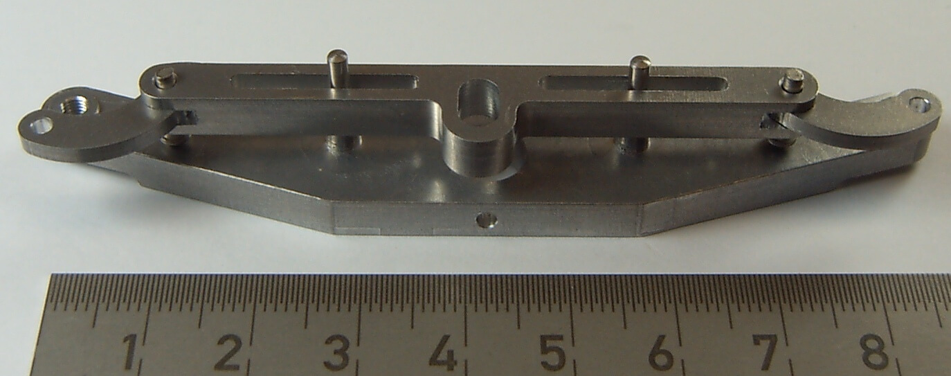 Diese, aus massivem Alu gefräste Achse, verhindert, dass der Stapler selbst bei ständigem Betrieb oder längerem Stehen, jemals wieder X-Beine bekommt. Als Zurüstteile zur Komplettierung der Achse werden die Originalteile des Bausatzes verwendet.