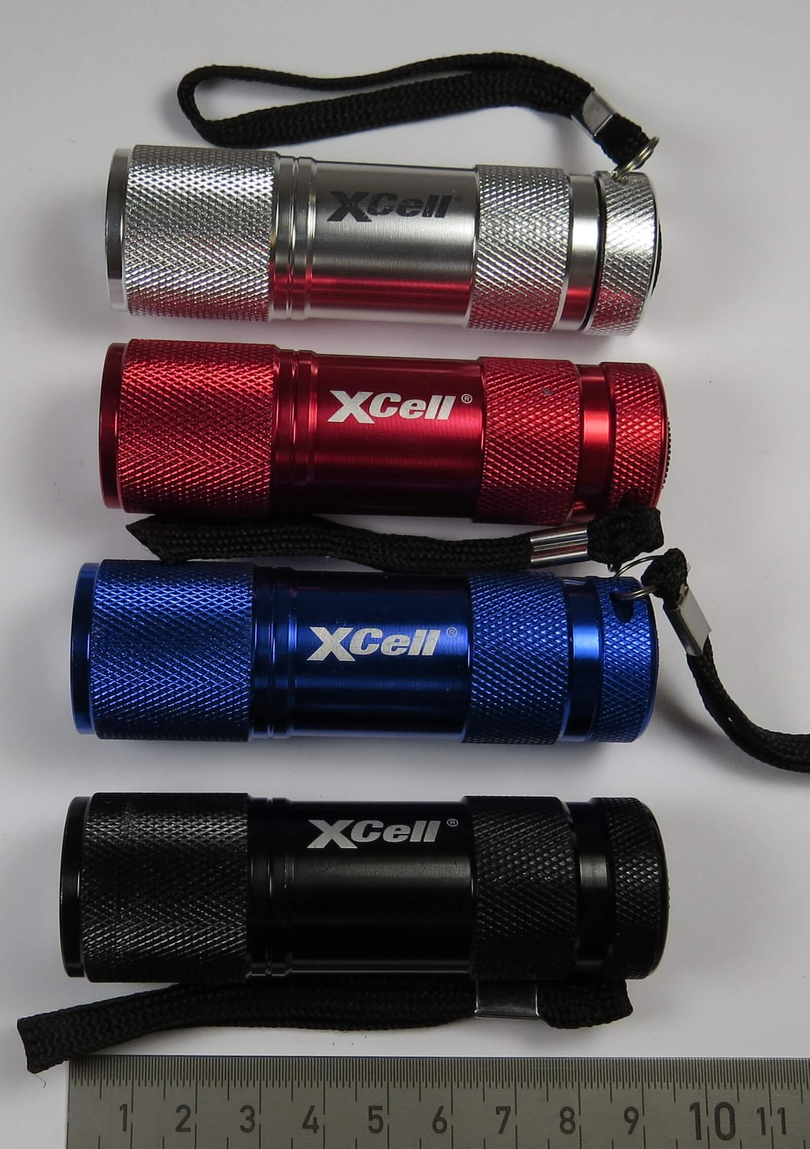 1 Alu-Taschenlampe XCELL Basic 9 LED. Taschenlampe mit 9 weißen LED, Alu- Gehäuse, Handschlaufe. Mit 3 Batterien AAA/LR03 bestückt. Rot/silber/schwarz/ blau verfügbar.