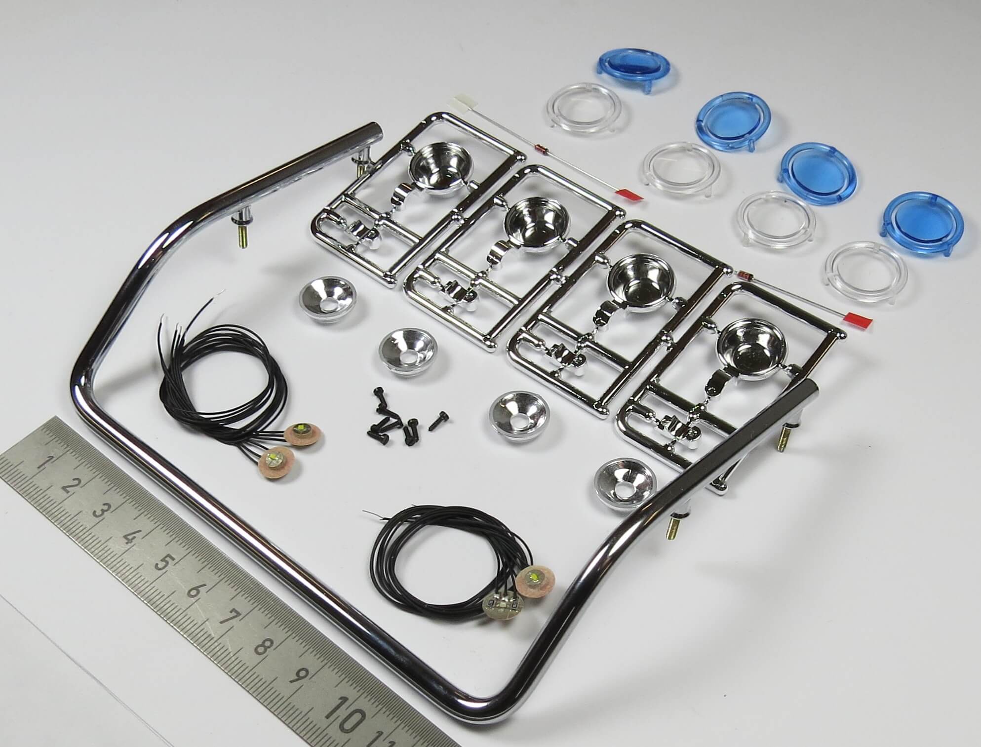 1 Dachlampenbügel-SET f. ACTROS (Tamiya) MS vernickelt mit 4 stehenden Lampen, verchromt - mit Angel Eyes Effekt weiss/ weiss. Für 7,2-12V geeignet!. 1 Stück. Bügeldurchmesser: 5mm.