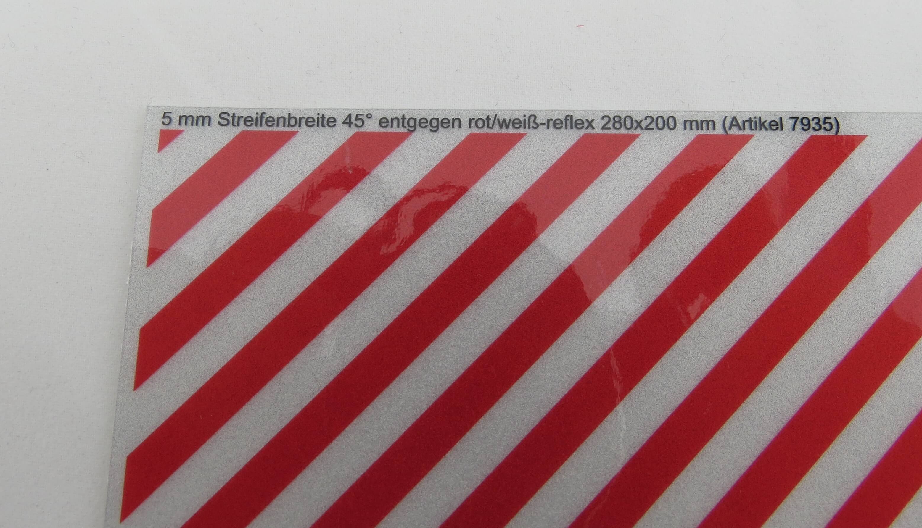 1 Dekorbogen Warnstreifen REFLEKTIEREND ca. 280x200mm 5mm-Streifen, rot/weiß-reflektierend, selbstklebend 45° rechts/links-gegenläufig.