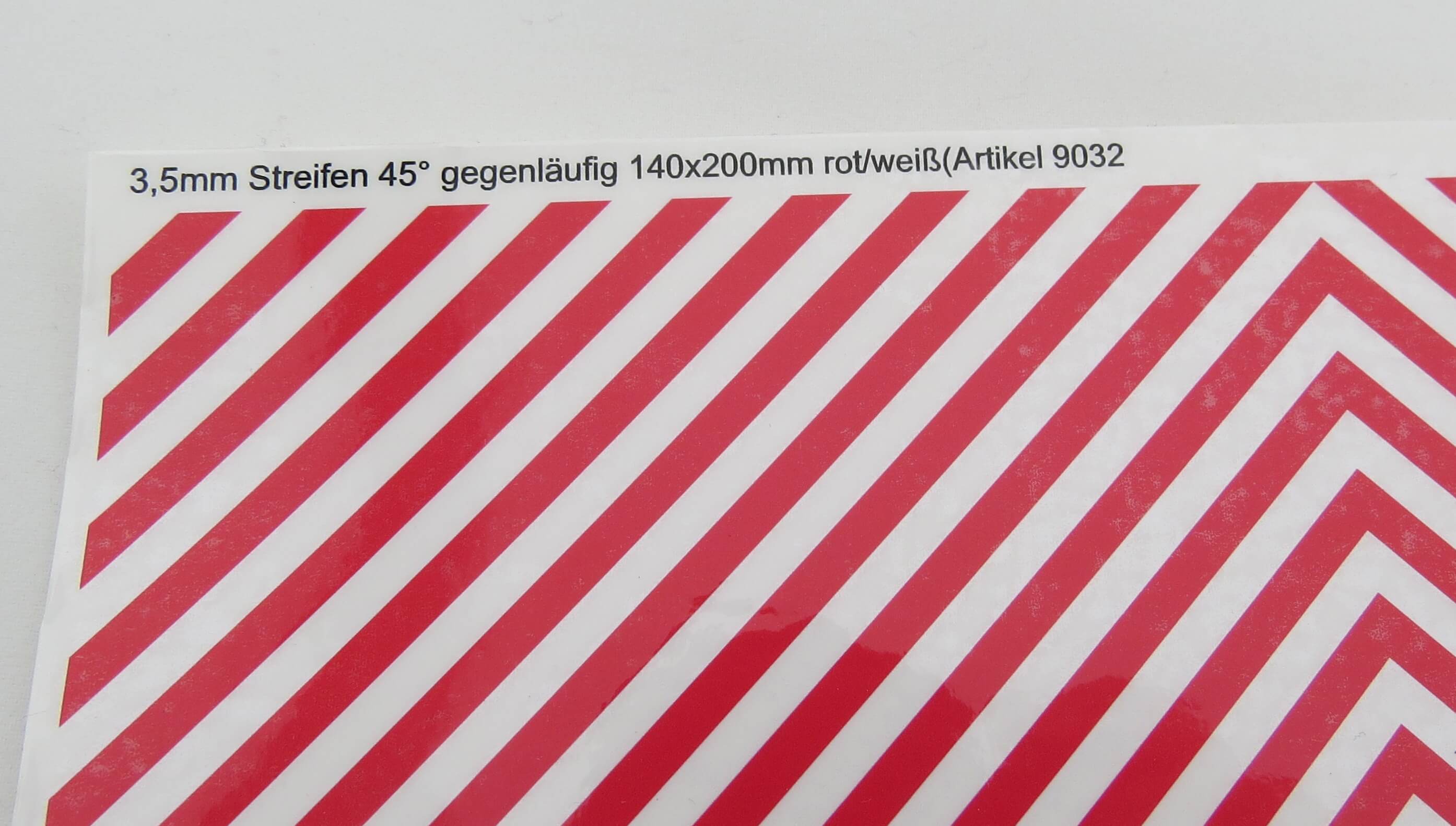 1 Dekorbogen Warnstreifen STANDARD, ca. 200x140mm 3,5mm-Streifen, rot/weiß, selbstklebend, OHNE Reflex! 45° rechts/links-gegenläufig.