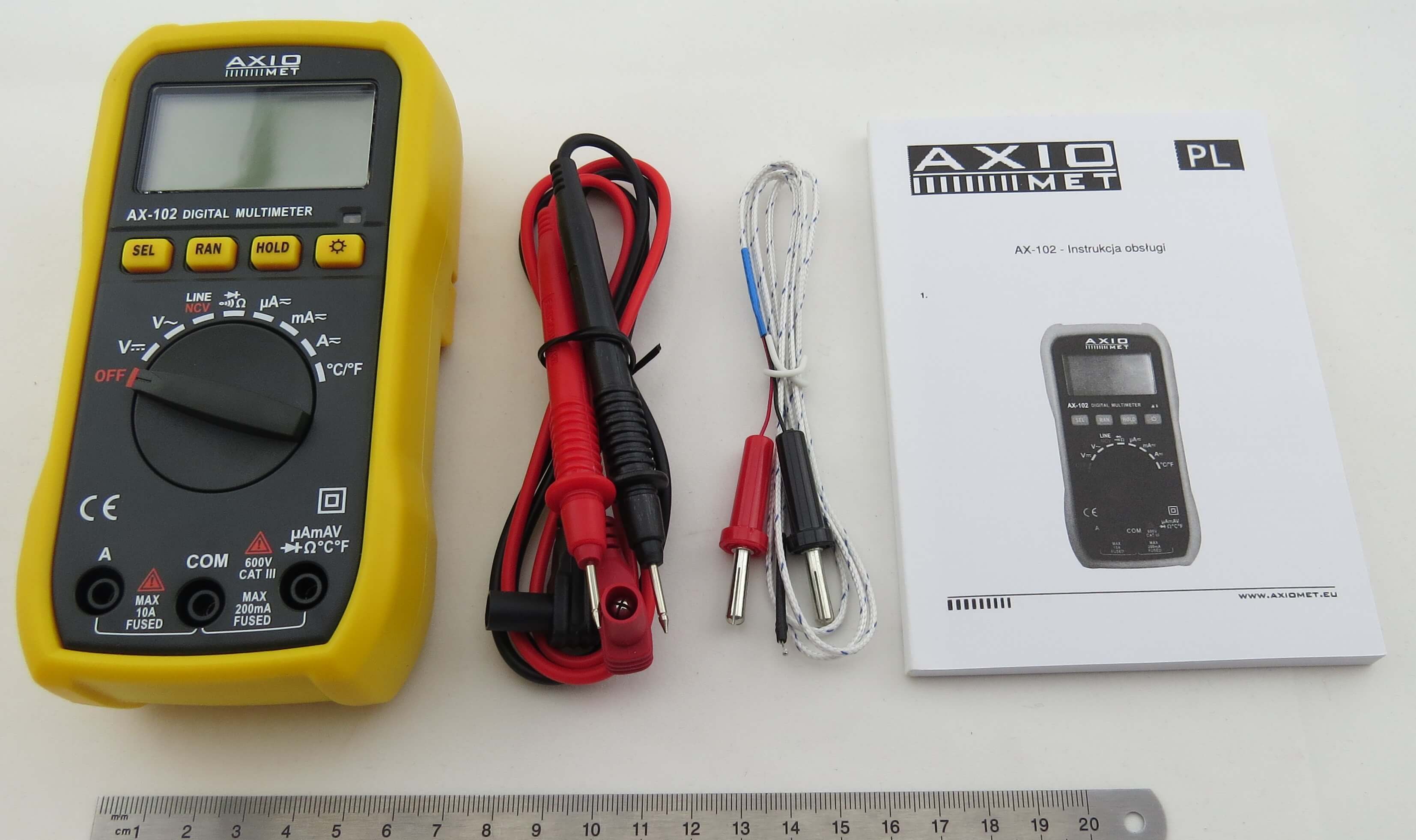 1 tragbares digitales Multimeter AX-102 1 Paar Messkabel (rot/schwarz) mit Prüfspitze 1 Temperatur-Meßkabel 1 Anleitung
