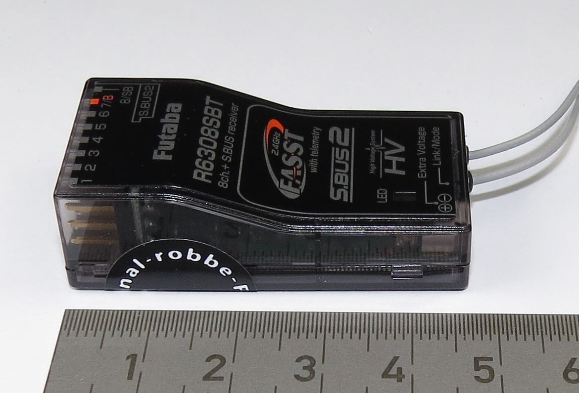 1 Empfänger 2,4GHz R-6308SBT 8 Kanäle 2 Antennen, FASST-System, Futaba. Mit Telemetrie. Mit S.BUS-Ausgang. 47x25x14,3mm. 13gr. Gewicht. Strom: 50mA.