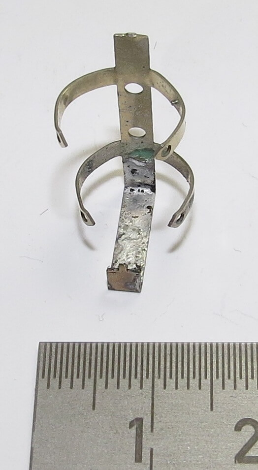 1 FERTIGER Feuerlöscher-Halter passend zu Wedico-Größe. Gesamthöhe 21mm, Breite über alles ca. 11mm. Aus geätztem Neusilber-Blech. Natur belassen.