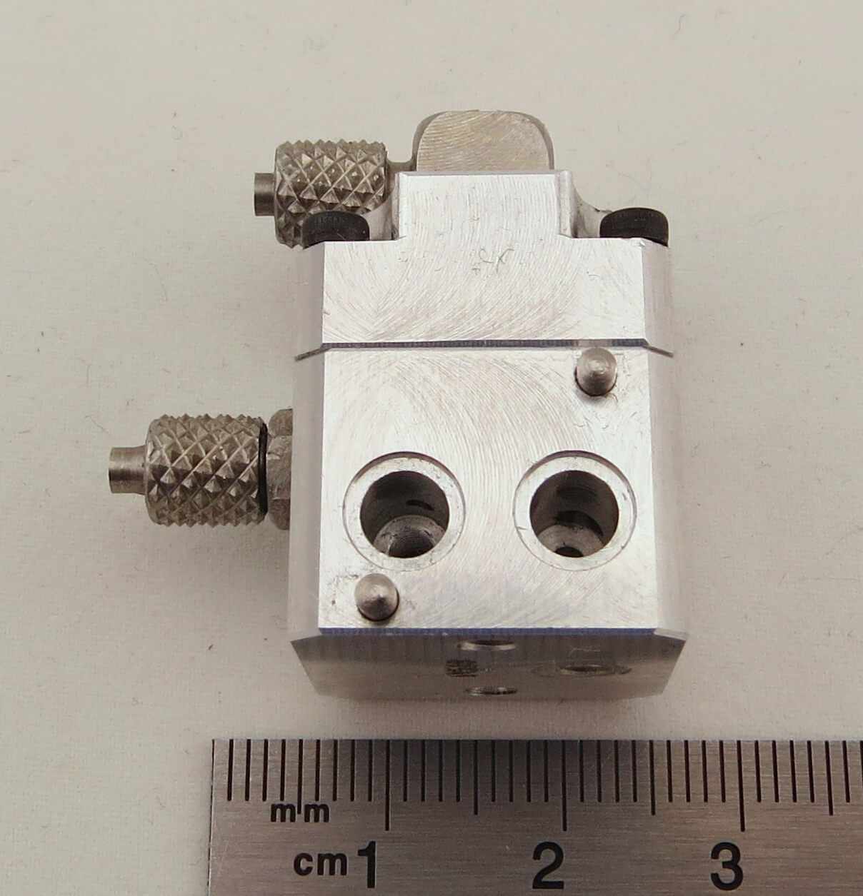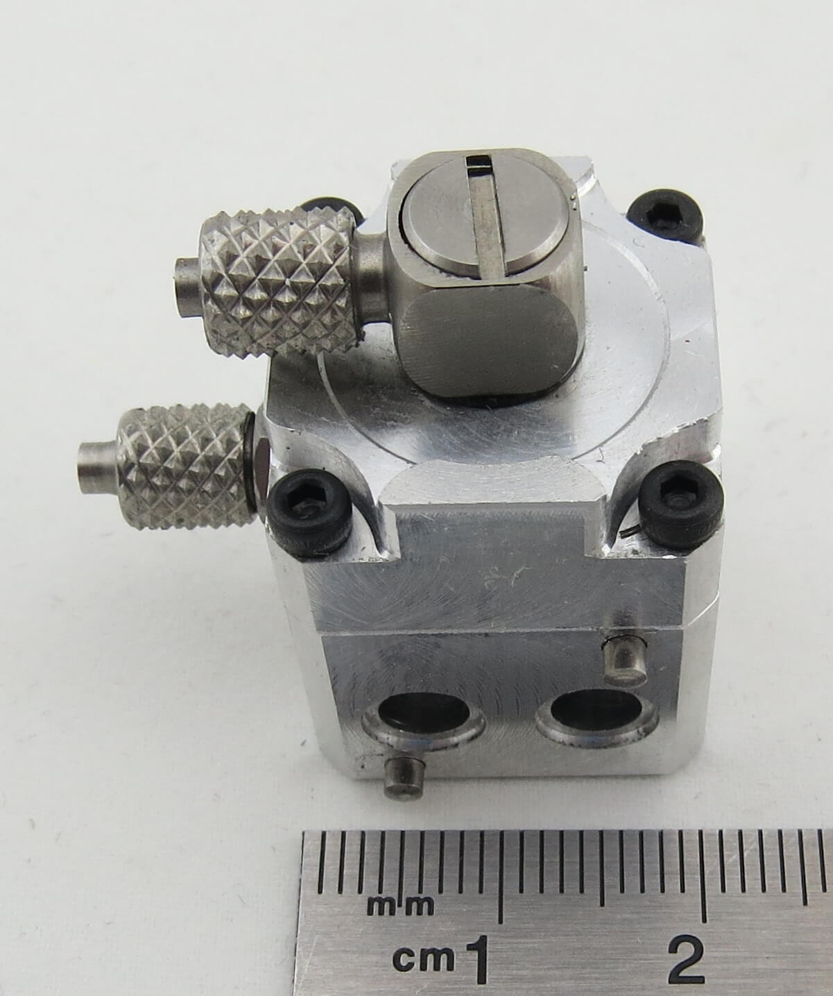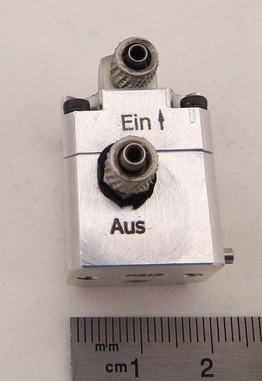 1 Hydraulik-Ein-/Auslassblock. Je Steuerventilblock wird 1 E/A-Block benötigt. Abmessung: 20x20x32mm. Der E/A-Block wird mit geraden Nippeln und Überwurfmuttern geliefert.