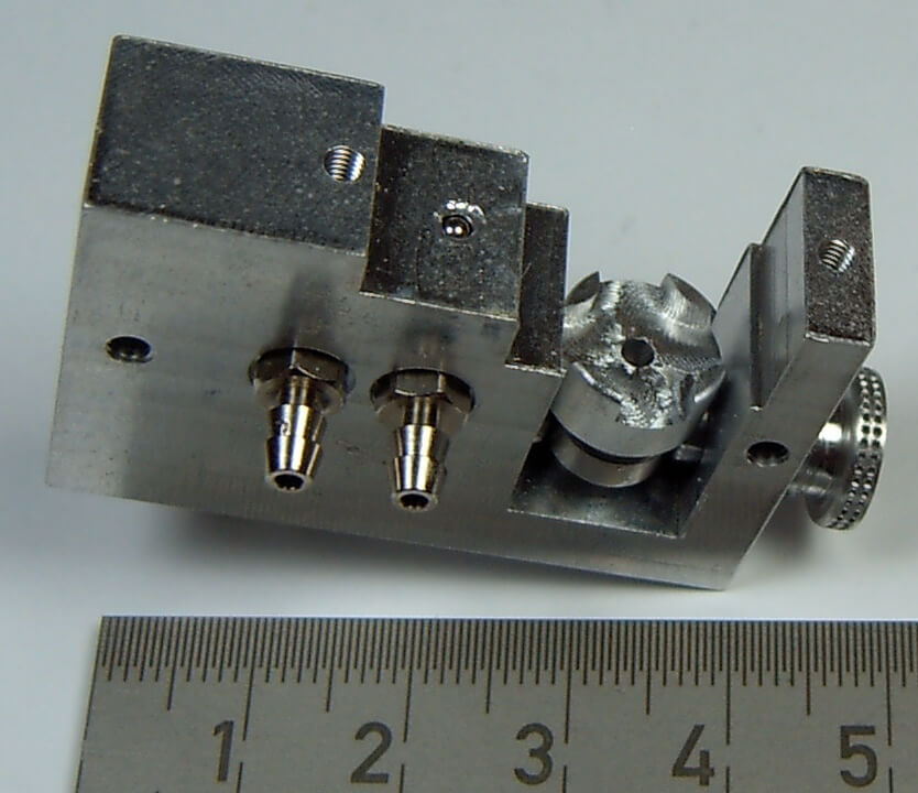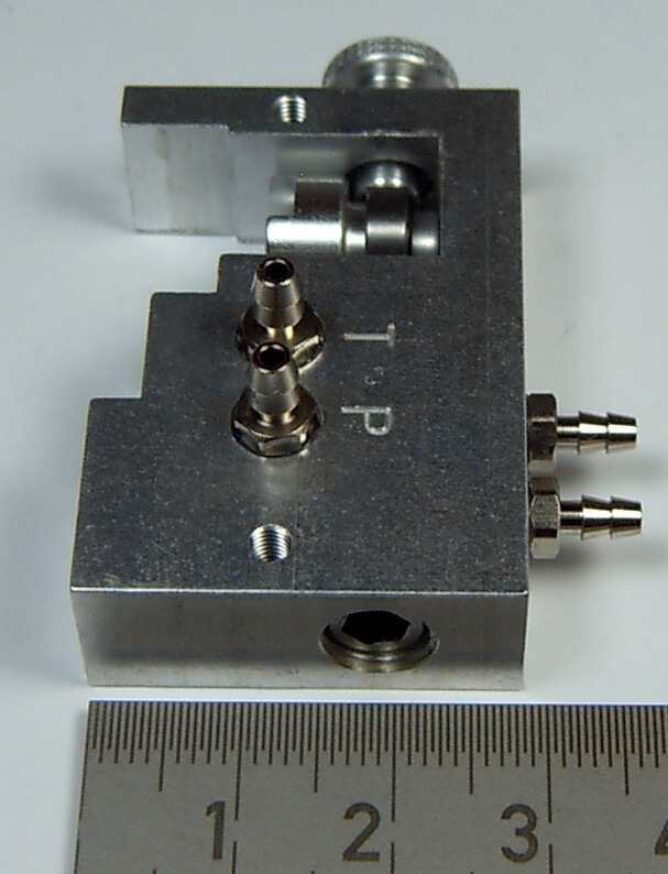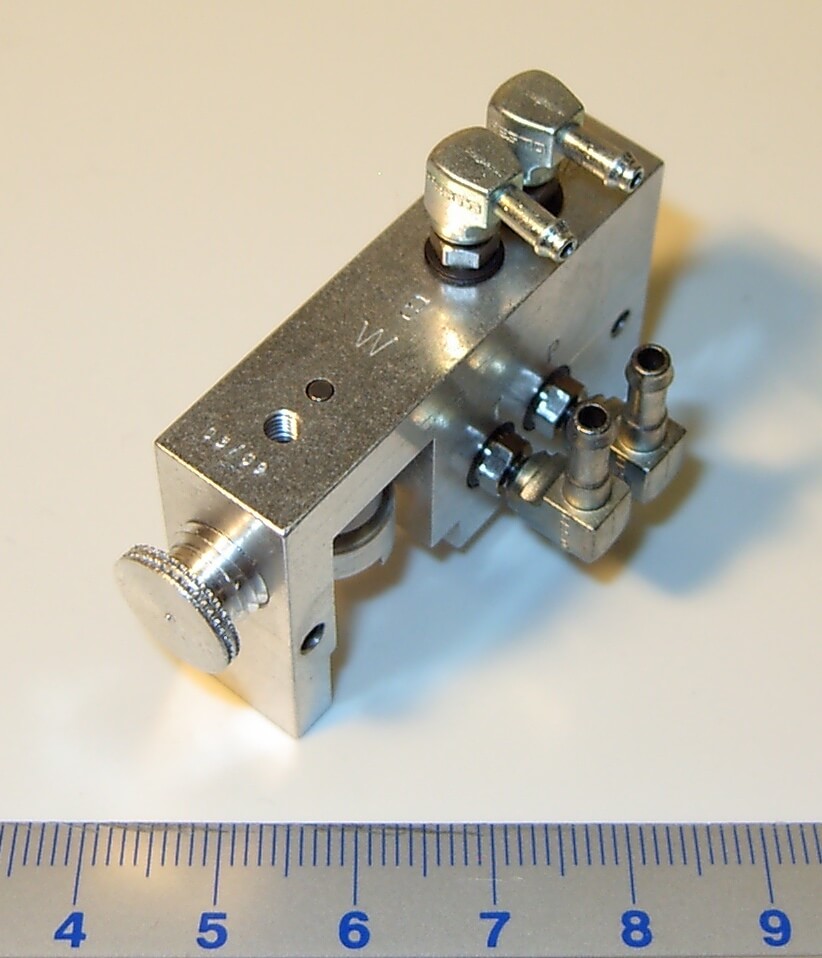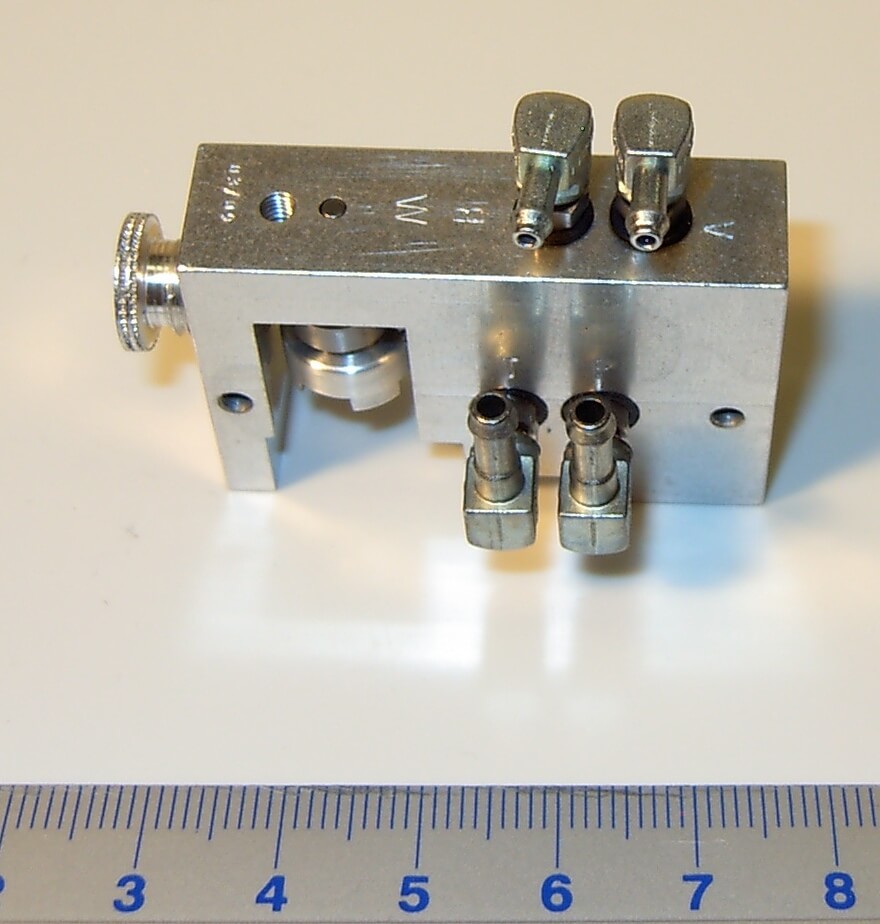 1 Hydraulik-Steuerventil 1-fach, bis 10bar. Maße (ohne Anschlußnippel): 43x29,5x12mm. 0H501 Anschluß P+T=H023, Zylinder A+B=H022
