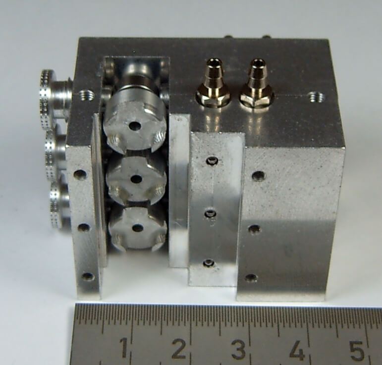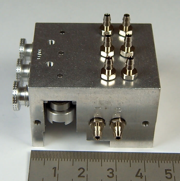 1 Hydraulik-Steuerventil 3-fach, bis 10bar. Maße (ohne Anschlußnippel): 43x29,5x36mm. 0H503. Für Servo HS-53.