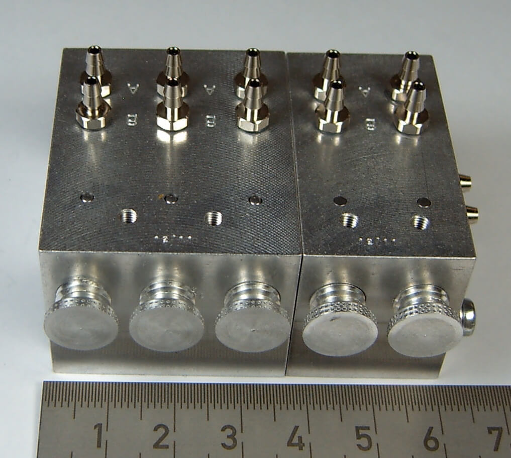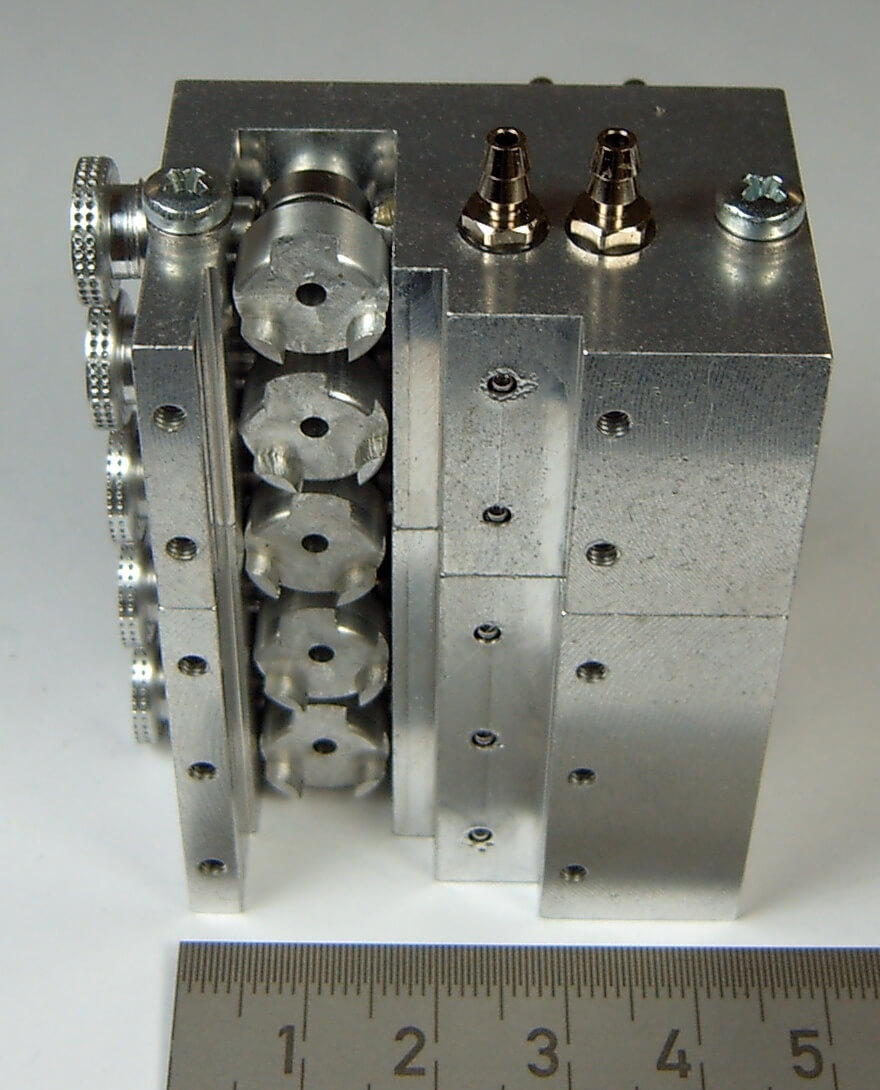 1 Hydraulik-Steuerventil 5-fach, bis 10bar. Maße (ohne Anschlußnippel): 43x29,5x60mm. 0H505