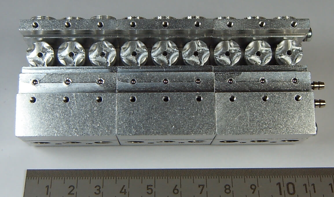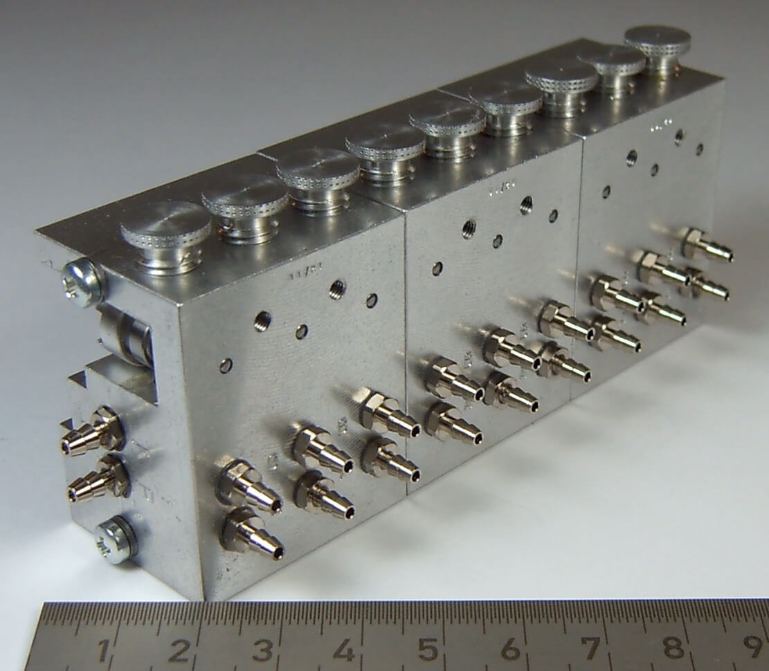 1 Hydraulik-Steuerventil 9-fach, bis 10bar. Maße (ohne Anschlußnippel): 43x29,5x108mm. 0H509.