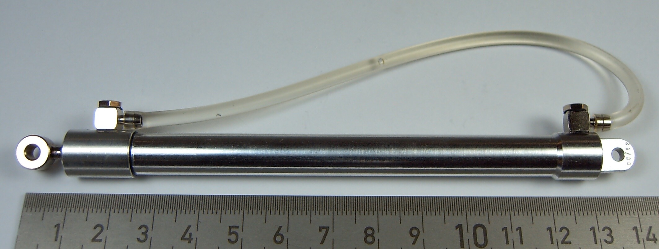 1 Hydraulik-Zylinder 7 - 100, bis 10bar. Doppelseitig wirkend. Leimbach 0H07100A. Abgewinkelte Anschlüsse M3/1,5mm.