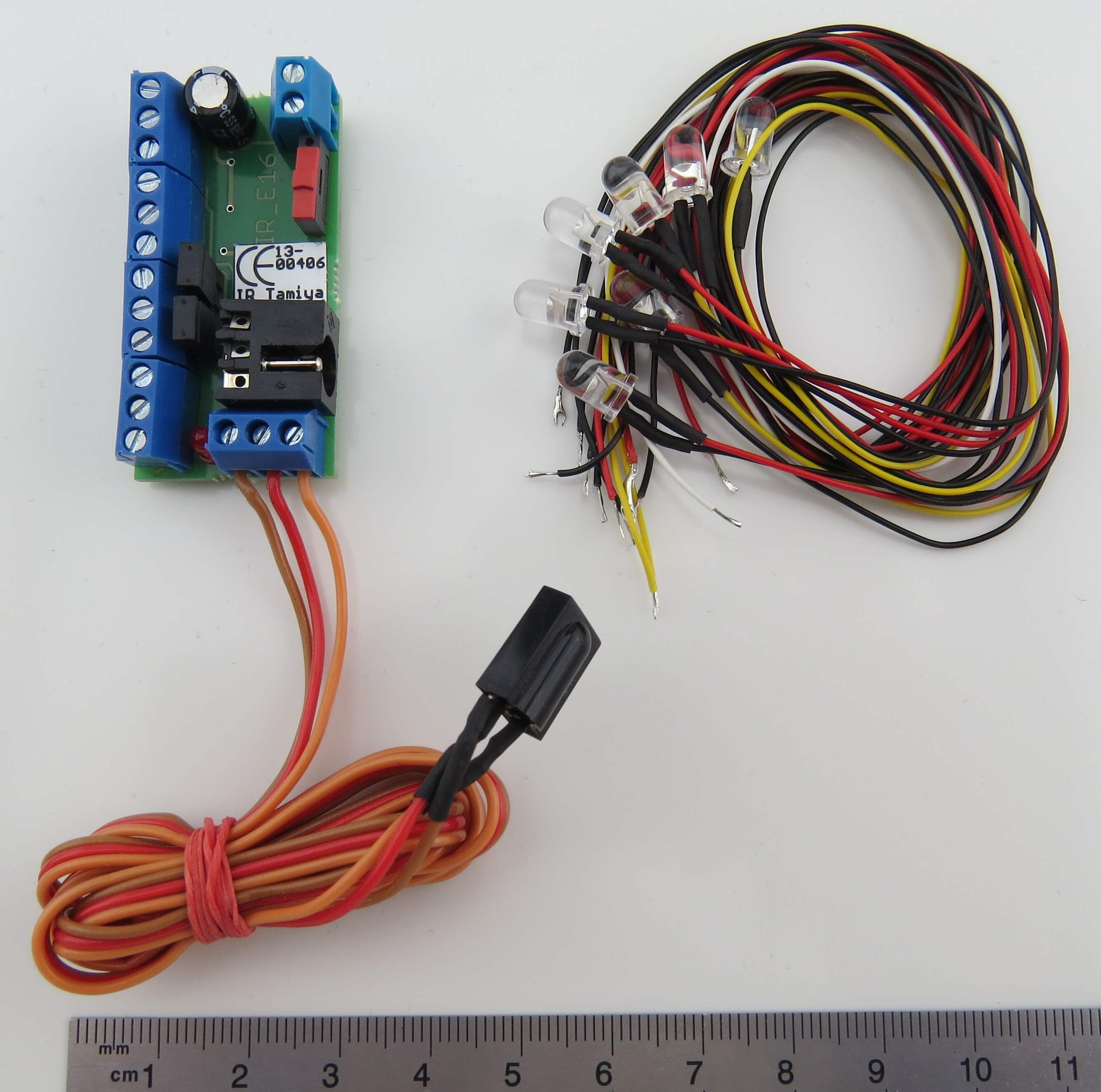1 Infrarot-Empfänger als Ergänzung zur MFC-01/03 von Tamiya. Mit IR-Empfänger, IR-Empfangsplatine, Kabelsatz. Zum Anschluß von einzelnen LEDs. Ohne Rück- Fahrlicht-Funktion.