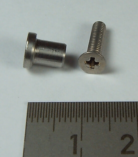 1 Königsbolzen Wedico-Größe. Aus V2A (Edelstahl), mit Befestigungsschraube. Durchmesser 7mm, Höhe 7,6mm, Bund- Durchmesser 4,8mm. Mit 1 Senkkopf- schraube M3x12mm.