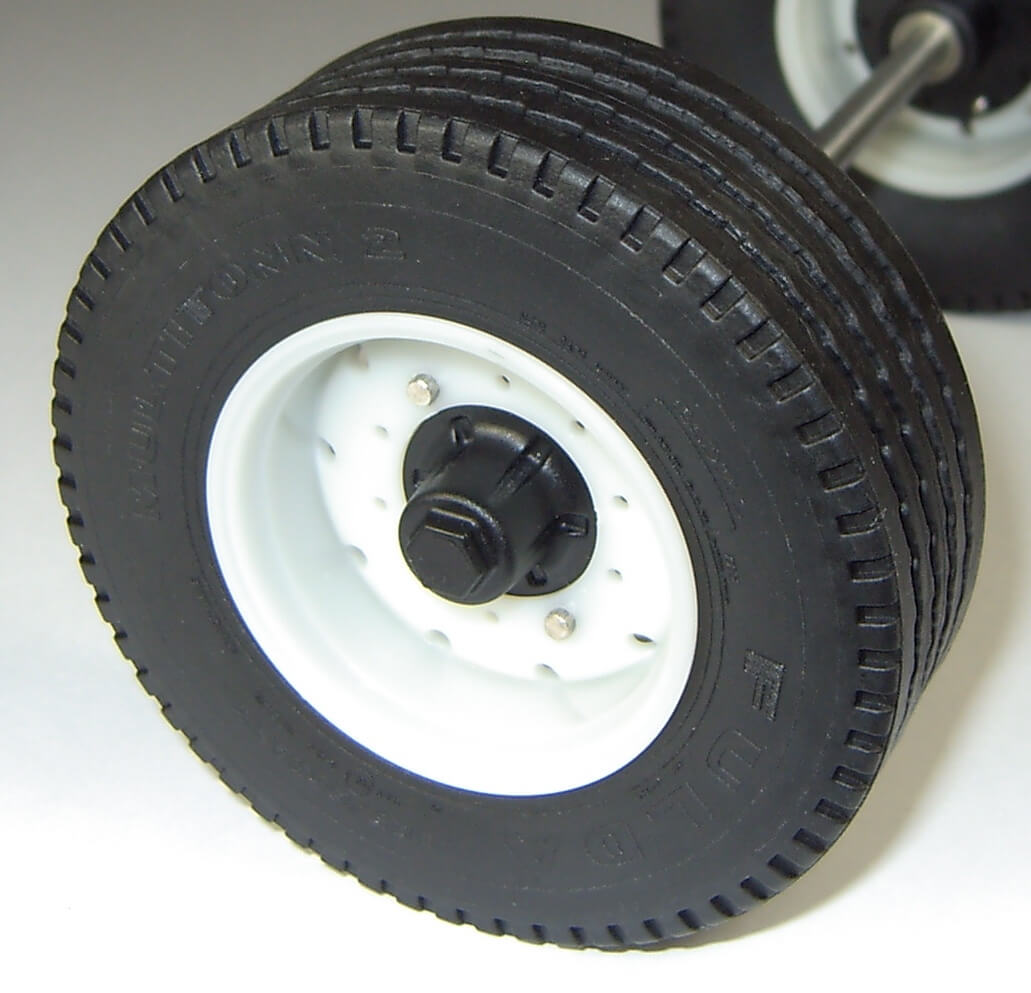 1 Komplett-Auflieger-/Anhängerachse, Edelstahl 160mm Länge, 6mm Durchmesser. Außengewinde M3. Mit 2 Stopmuttern. Komplett mit Kugellagern, Naben, Felgen, Reifen und Sechskantschrauben.
