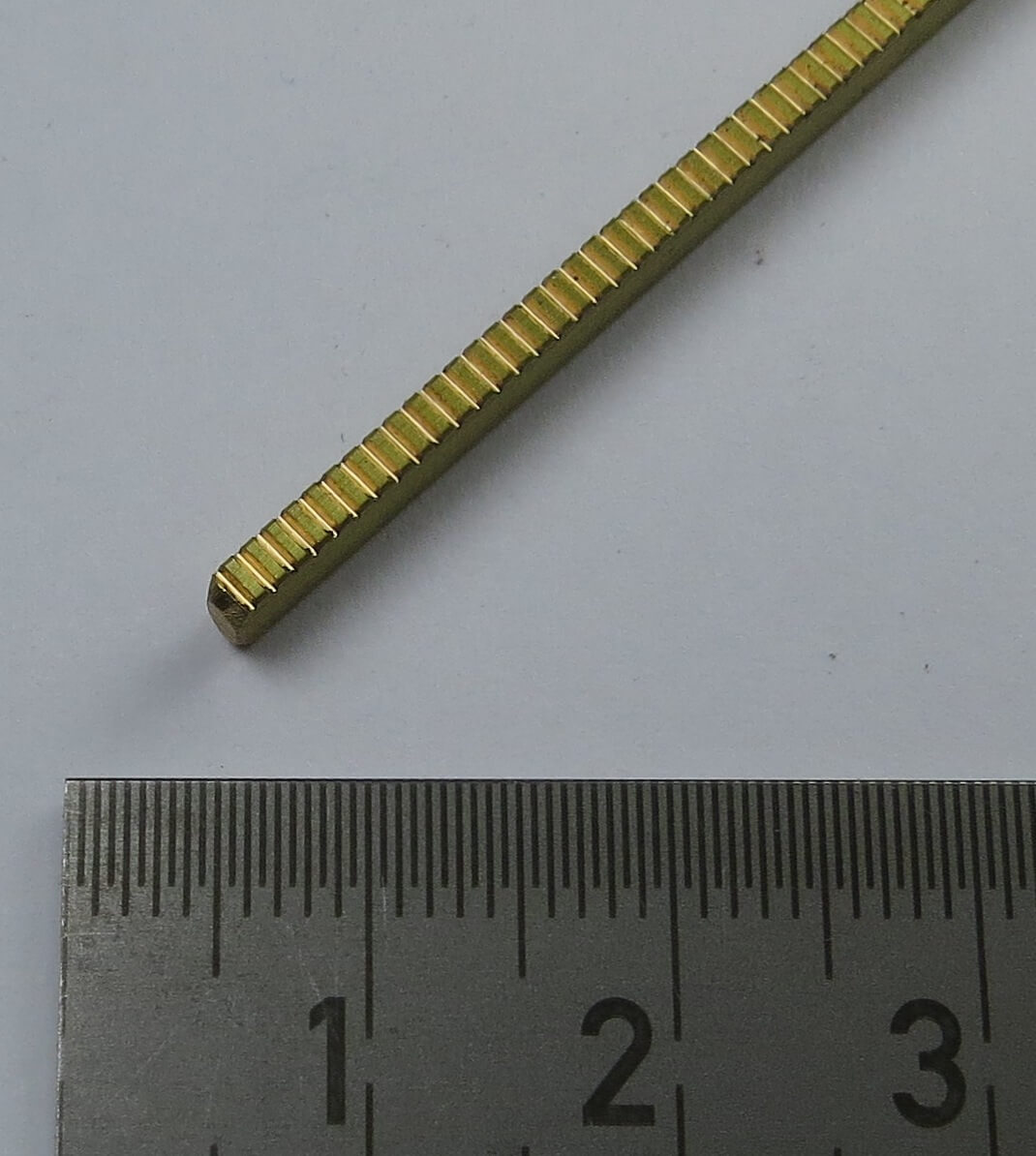 1 Messing-Zahnstange Ms58, Modul 0,3 Zahnbreite 2mm Höhe 4mm, Länge 250mm. Eingriffswinkel 20°, Gewicht 14gr.