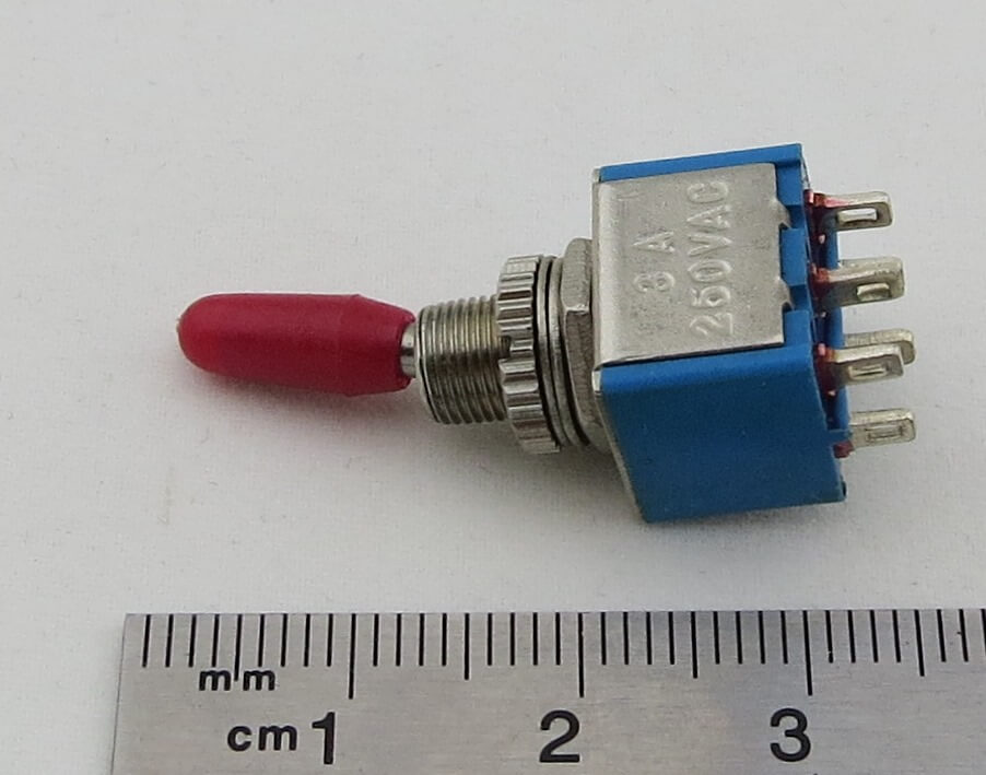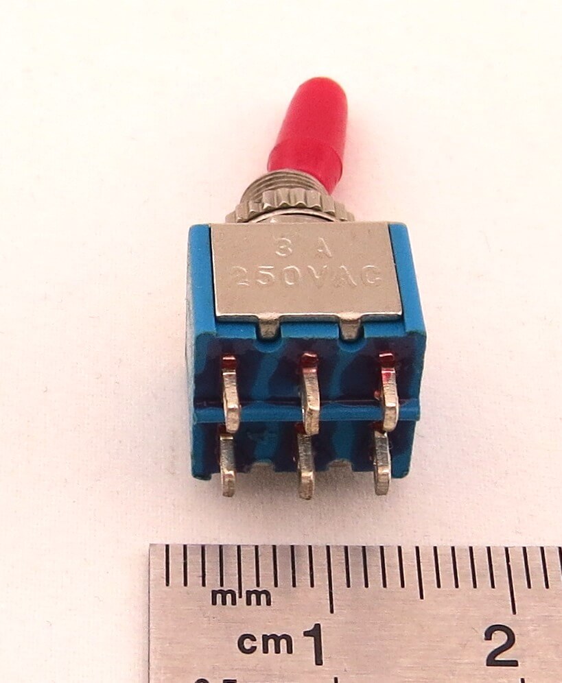 1 Miniatur-Kippschalter 2x UM (2-polig) 2x UM, schaltend mit Mittelstellung 50V, 3A, RM2,54 Lötmontage, stehend.