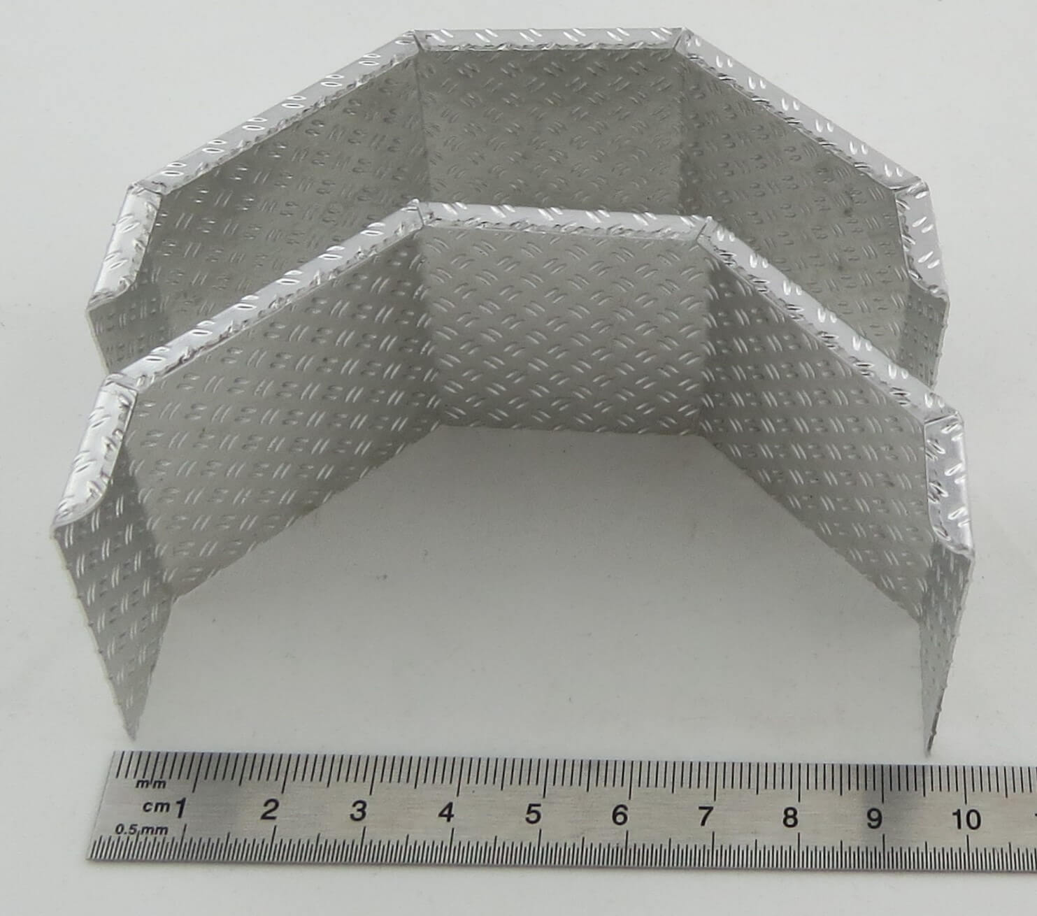 1 Paar Alu-Kotflügel für 1 Achse Zwillings-Bereifung. Wedico Maßstab. Gesamtlänge 93 mm, Breite 45 mm, Höhe 50 mm. Lieferung erfolgt ohne Halter.