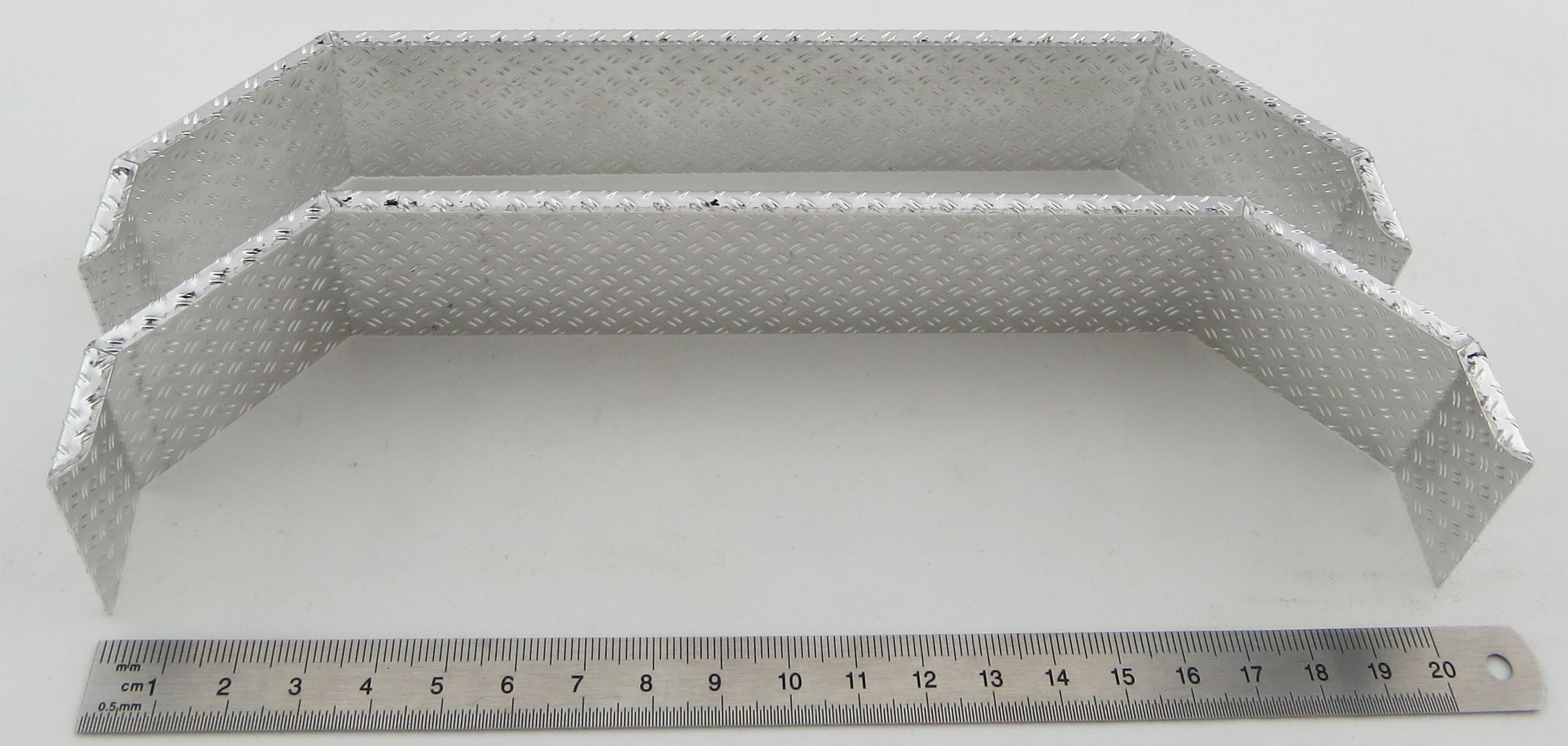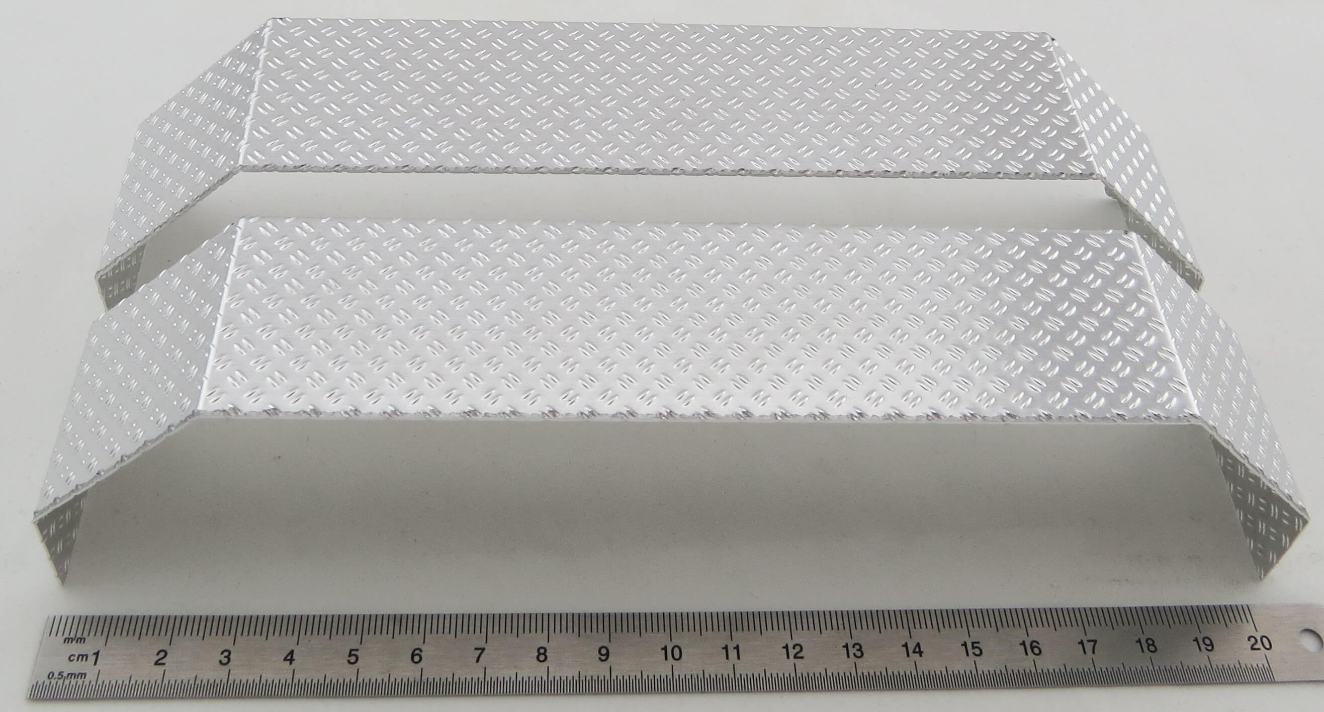 1 Paar Alu-Kotflügel für 2 Achsen Single-Bereifung. Tamiya Maßstab. Gesamtlänge 205 mm, Breite 38 mm, Höhe 50 mm. Lieferung erfolgt ohne Halter.