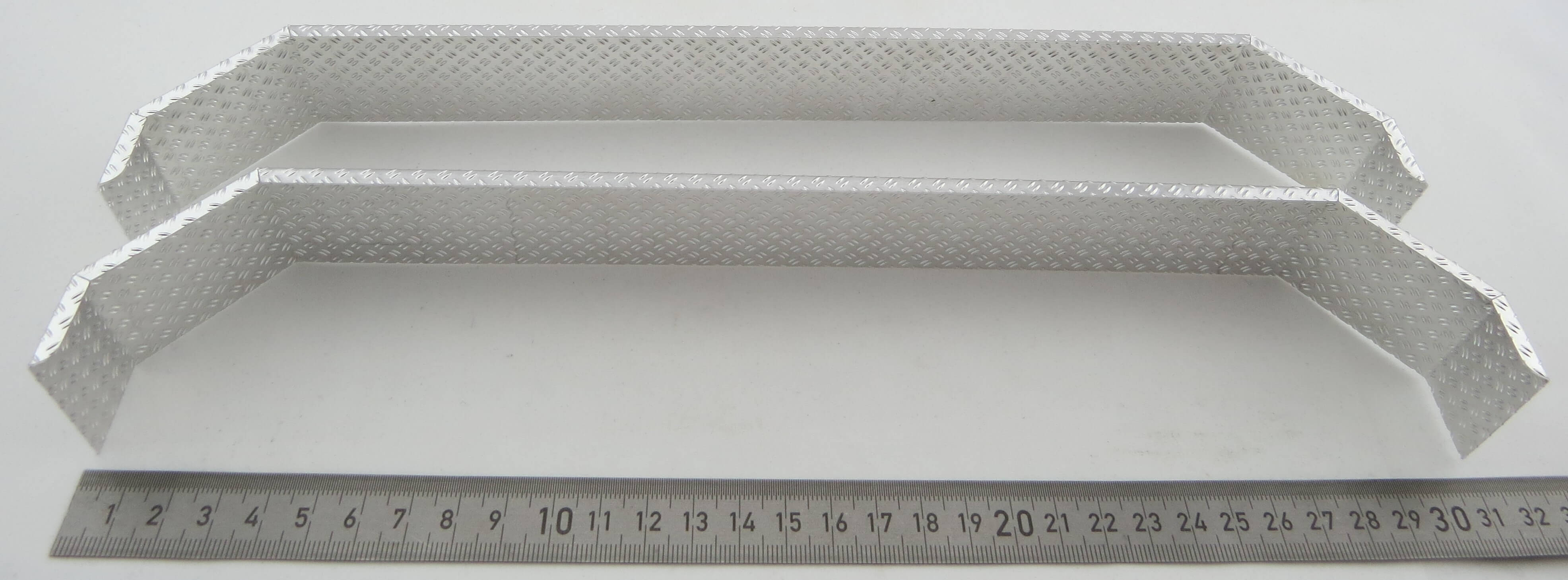 1 Paar Alu-Kotflügel für 3 Achsen Single-Bereifung. Tamiya Maßstab. Gesamtlänge 310 mm, Breite 38 mm, Höhe 50 mm. Alu-Riffelblech. Lieferung erfolgt ohne Halter.