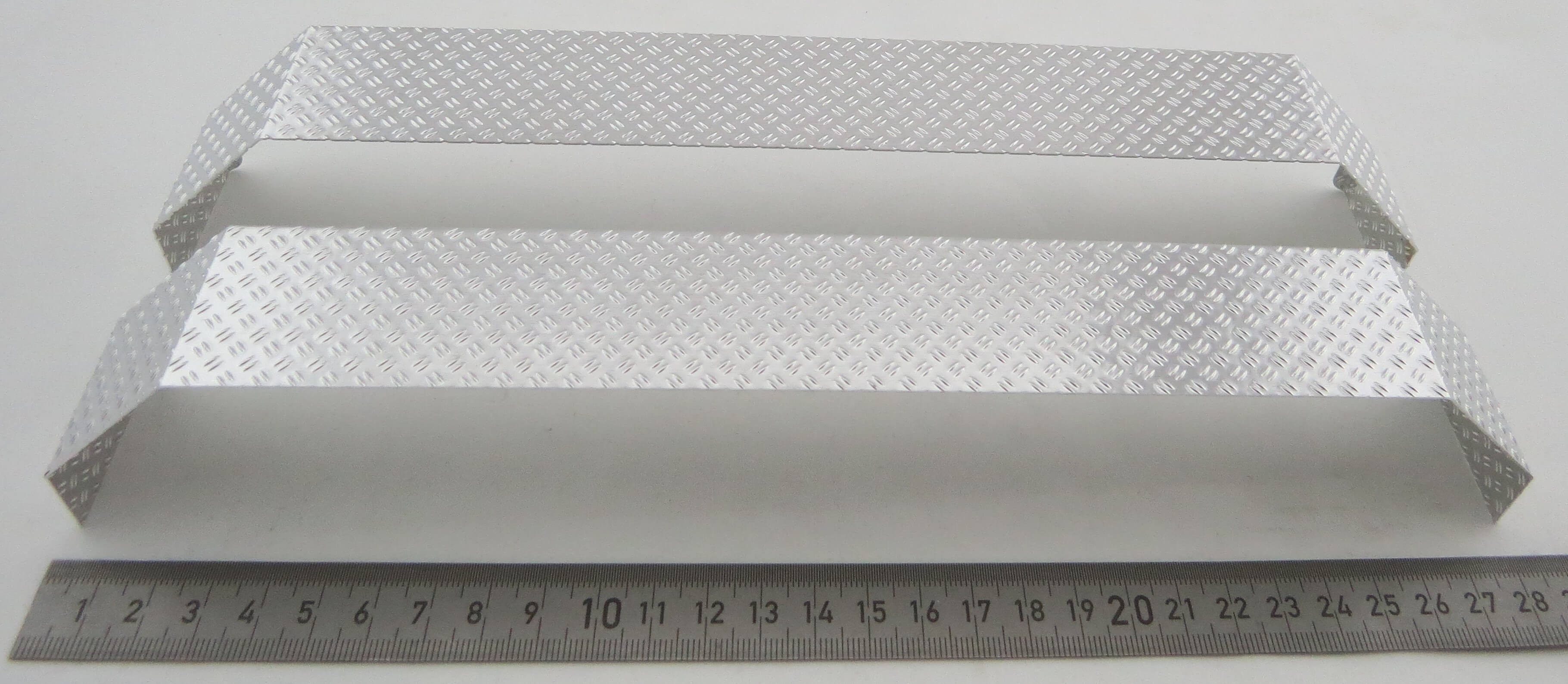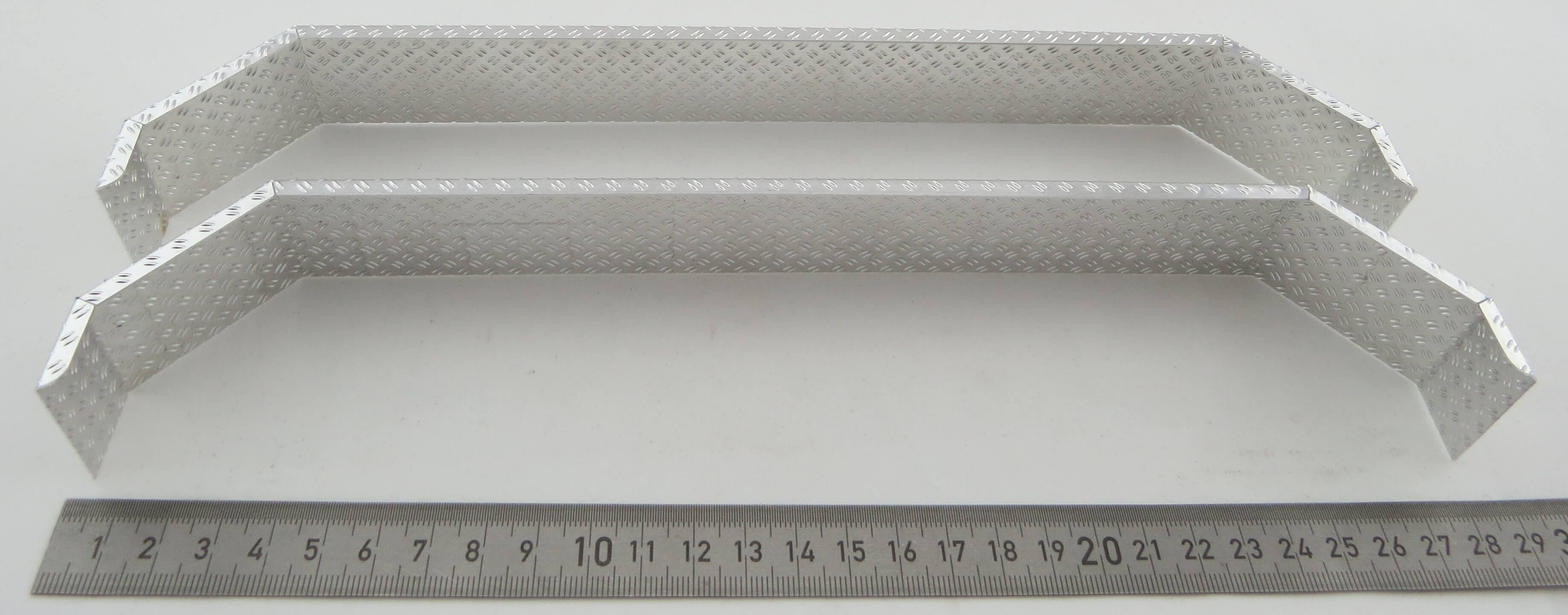 1 Paar Alu-Kotflügel für 3 Achsen Single-Bereifung. Wedico Maßstab. Gesamtlänge 278 mm, Breite 34 mm, Höhe 50 mm. Alu-Riffelblech 0,5mm. Lieferung erfolgt ohne Halter.