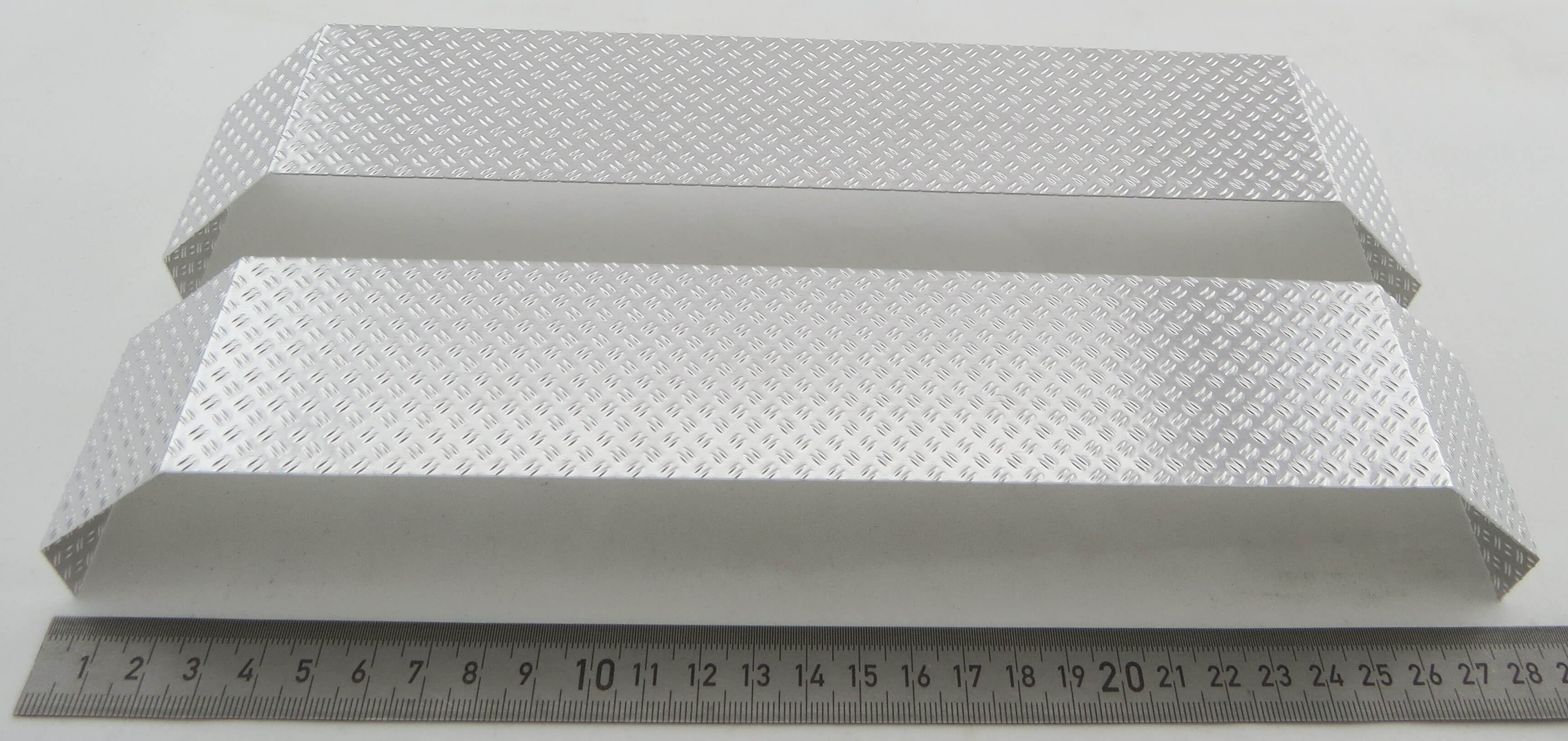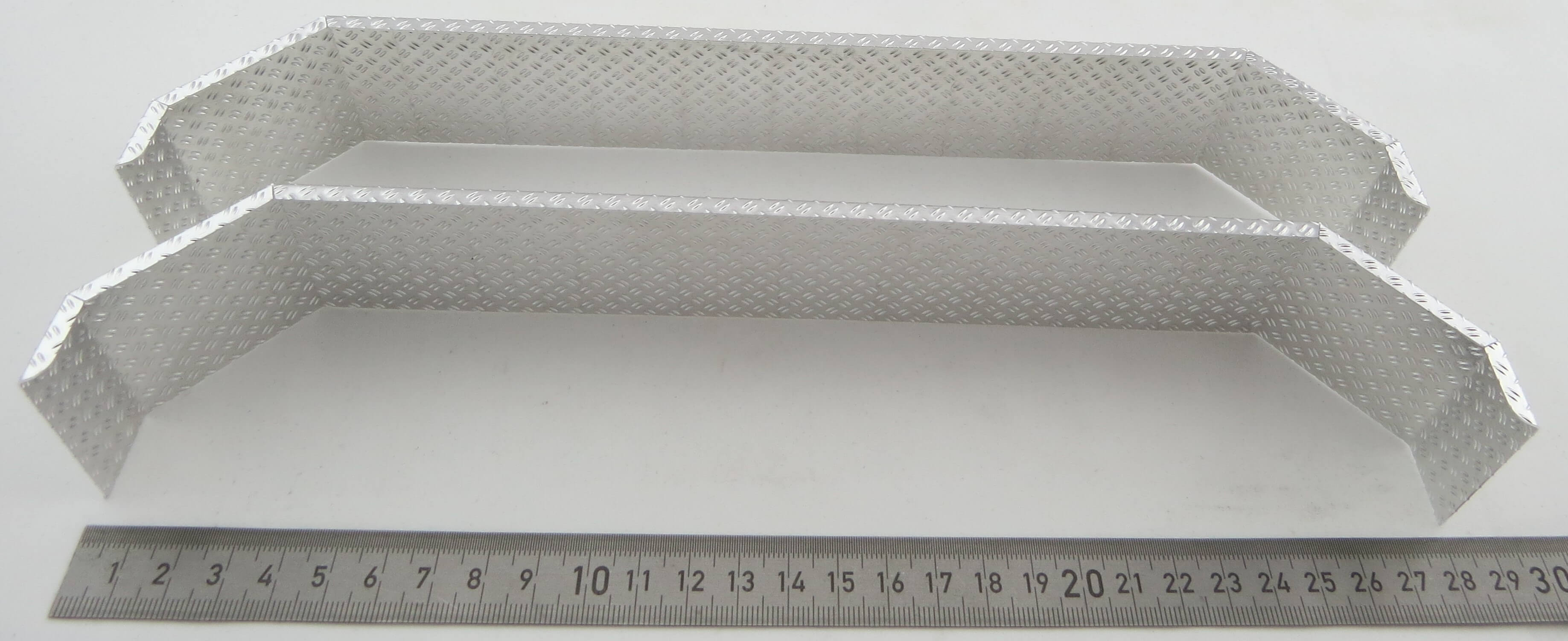 1 Paar Alu-Kotflügel für 3 Achsen Zwillings-Bereifung. Wedico Maßstab. Gesamtlänge 278 mm, Breite 45 mm, Höhe 50 mm. Lieferung erfolgt ohne Halter.