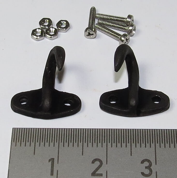 1 Paar Anschraub-Haken mit Befestigungs- Material, Messing-Feinguss. Als Zurr- punkt verwendbar. Befestigungsplatte ca. 16x7mm. Hakenlänge ca. 16mm. GESCHWÄRZT! Messing, GESCHWÄRZT.