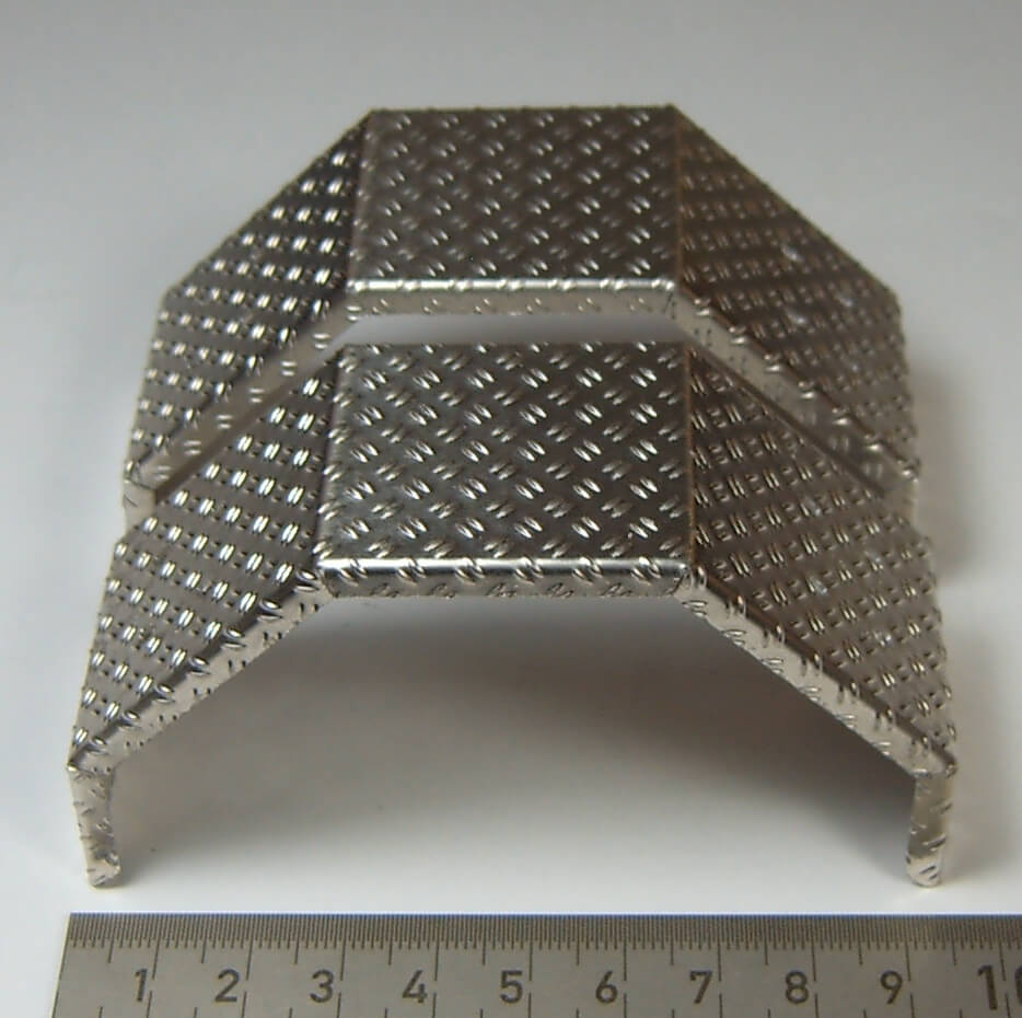 1 Paar Kotflügel Riffelblech, schmal, für eine Achse. Gebohrt. Gesamtlänge 93mm. Breite 34mm. Höhe 48mm. Mit Haltern und Kleinteilen.