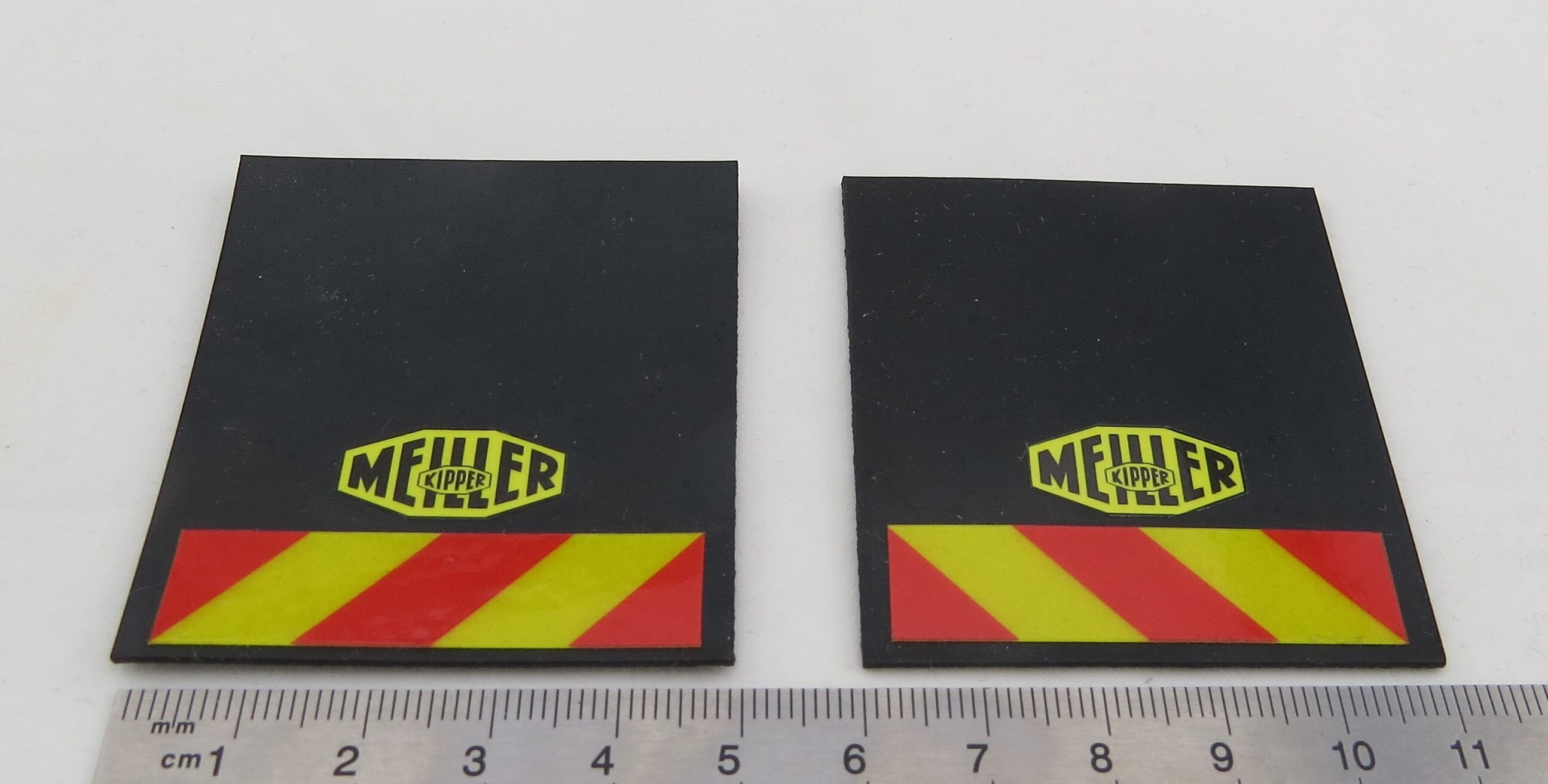 1 Paar Schmutzlappen 55 x 50mm (H x B) mit individuellem farbigem Text/Logo. Grundmaterial Gummi 1mm dick, schwarz. Die Bilder stellen nur Beispiele dar! (Tamiya-Größe). MIT ECE-A Kennzeichnung.