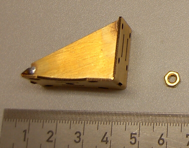 1 Reserverad-Halter, Messing, TAM-Größe. Komplett aus MS, fertig verlötet. 4 Löcher zur Befestigung am LKW-Rahmen. Maße: 22x20x30mm.