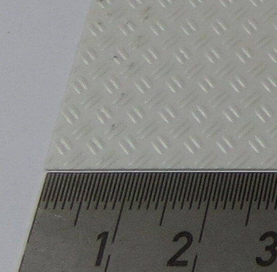 1 Riffelbelag-Platte Doppelreiskorn. Abm. 0,4x96x145mm. Sehr gut biegbar. Gut bearbeitbar. Für Maßstab 1:16 bis 1:14. Material: Polystyrol. 1 Stück.