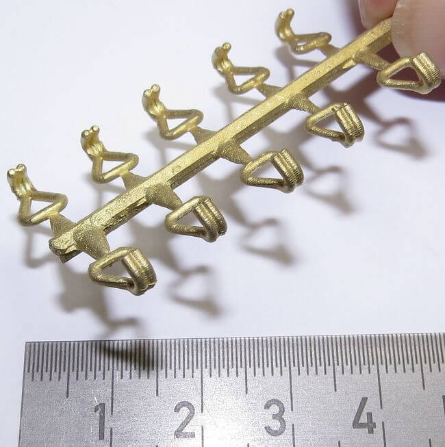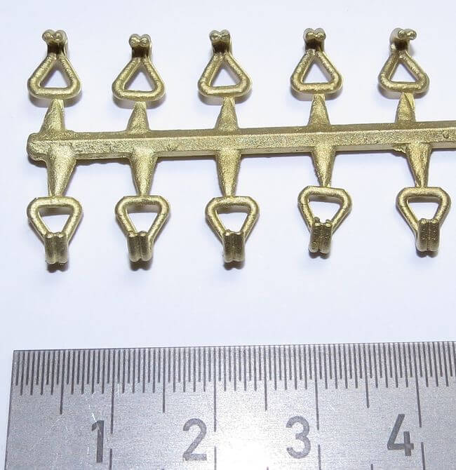 1 Set aus 10 Doppelhaken, klein.Messing- Feinguss, am Gieß-Ast. Maße je Haken ca. 7,5x6x4mm. Kleine Bauform.Die Haken sind mit mäßigen Zugkräften belastbar. Passend zum Tamiya- und Wedico-Maßstab.