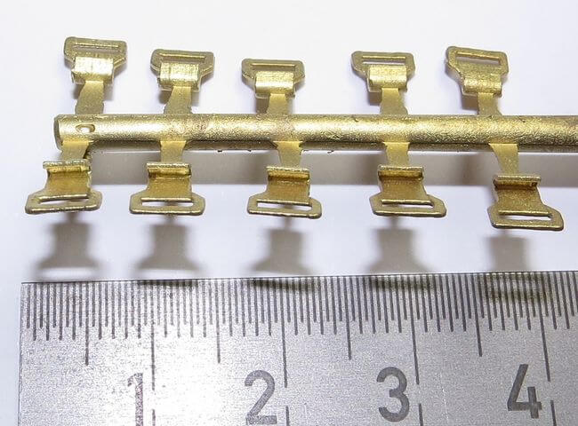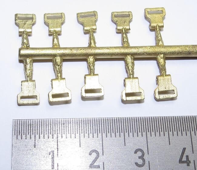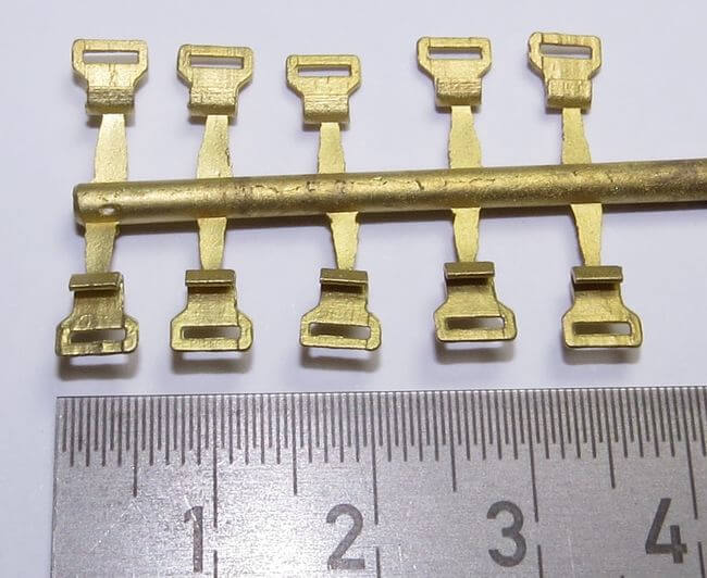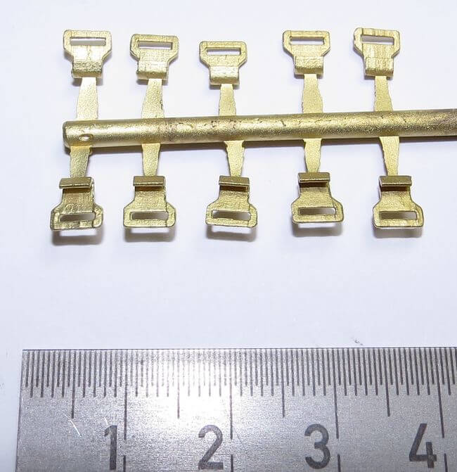1 Set aus 10 Flachhaken, lang, Messing- Feinguss, am Gieß-Ast. Maße je Haken ca. 6x5x2mm. Lange Bauform. Die Haken sind mit mäßigen Zugkräften belastbar. Passend zum Tamiya- und Wedico-Maßstab.
