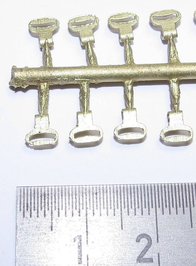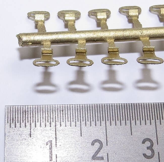 1 Set aus 8 Flachhaken, klein, Messing- Feinguss, am Gieß-Ast. Maße je Haken ca. 5x5x2mm. Kurze Bauform. Die Haken sind mit mäßigen Zugkräften belastbar. Passend zum Tamiya- und Wedico-Maßstab.