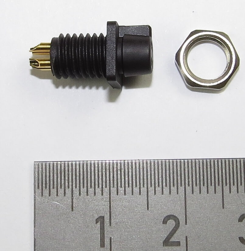 1 St. 4-polige Miniatur-Steckverbindung. Einbau-Dose (Buchse), verpolungssicher. Ca. 8x8x17mm mit Lötanschluss. Belastbarkeit 60V/3A je Kontakt.