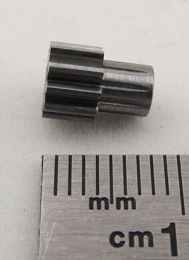 1 Stirnzahnrad aus Stahl (11SMnPb30) mit Nabe, Modul 0,5, 10 Zähne, 4mm Zahn- breite, Außendurchmesser 6,0mm, Bohrung 2H7, Nabenlänge 4mm.