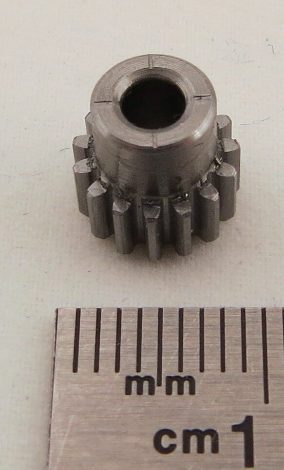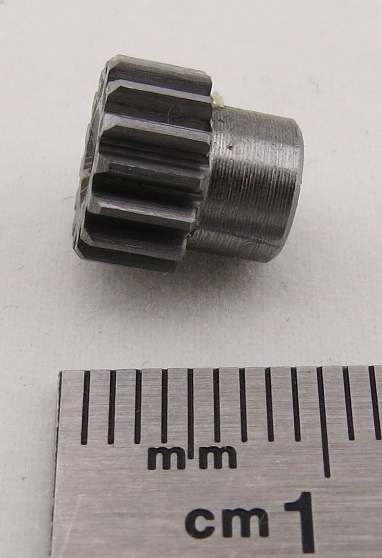 1 Stirnzahnrad aus Stahl (11SMnPb30) mit Nabe, Modul 0,5, 15 Zähne, 4mm Zahn- breite, Außendurchmesser 8,5mm, Bohrung 3H7, Nabenlänge 4mm.