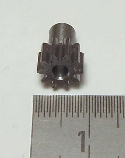 1 Stirnzahnrad aus Stahl (11SMnPb30) mit Nabe, Modul 0,7, 10 Zähne, 5mm Zahn- breite, Außendurchmesser 8,4mm, Bohrung 3H7, Nabenlänge 6mm.