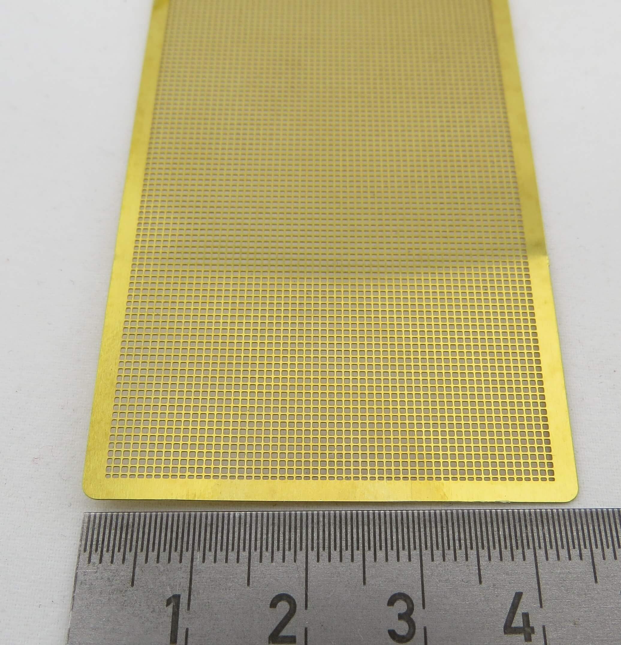 1 Streifen Lochblech, Messing 0,2mm. Größe ca. 305x45mm. 1 Stück. Lochung quadratisch in parallelen Reihen . Lochmaß 0,5x0,5mm.
