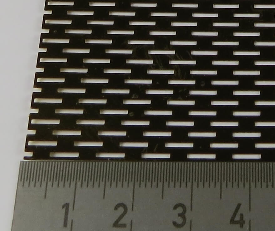1 Trittblech 100x250mm Messing. (5736/04) streifenförmige Ausbrüche. Materialstärke ca. 0,25mm. Größe der Ausbrüche ca. 5,0x0,7mm.
