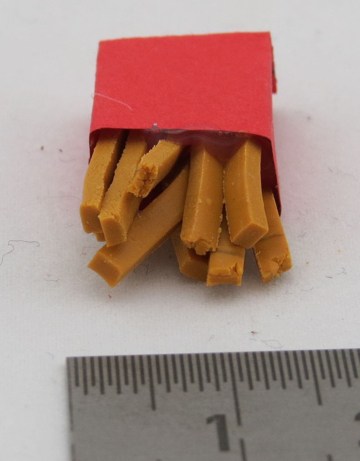 1 Tüte Pommes Frites. Ca. 13x22mm. -Nicht zum Verzehr geeignet!- Ausstattungs-Zubehör zur Ausgestaltung von Modellen 1:16 - 1:12.
