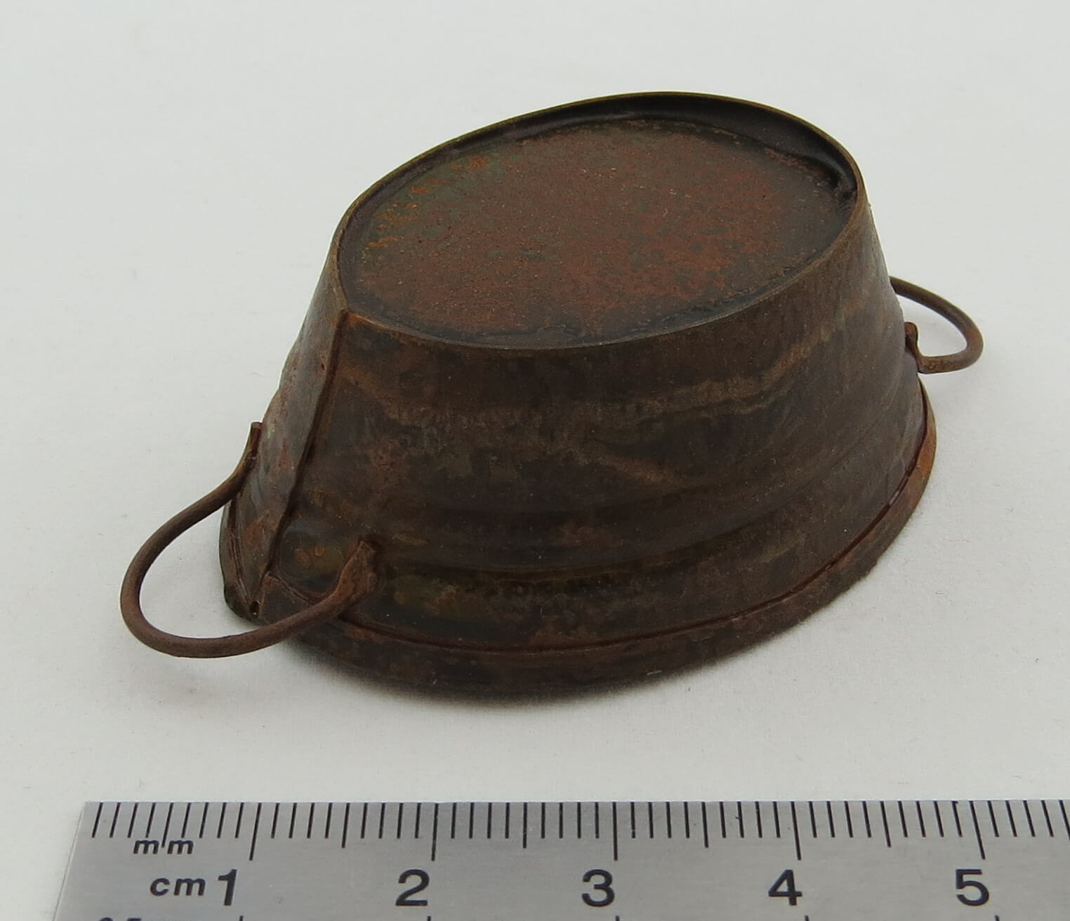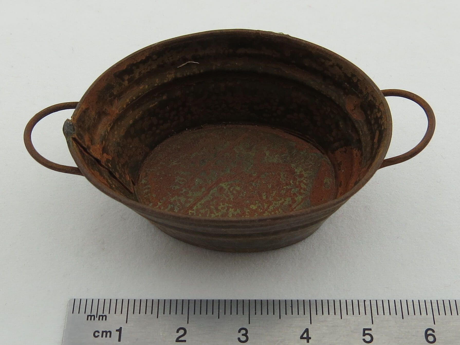 1 Wanne, oval, rostig. Ca. 5x4x2cm. Wanne mit 2 Griffen, aus Metall.