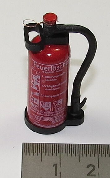 1 fertiger Feuerlöscher mit ovalem Griff Tamiya-Größe. Gesamthöhe 37mm, Breite über alles ca. 19mm. Behälterdurchmesser 11mm. Farbe rot mit weißer Beschriftung.