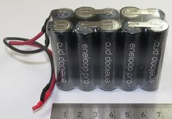 1x Akku-Pack mit 10x SANYO-Zellen, F5x2, 10 Zellen,12V, 2450mAh NiMH ENELOOP PRO, offenes Ende. Ca. 20cm Silikon-Kabel mit 1,5qmm. Ca. 310gr. 72x55x29mm über alles.