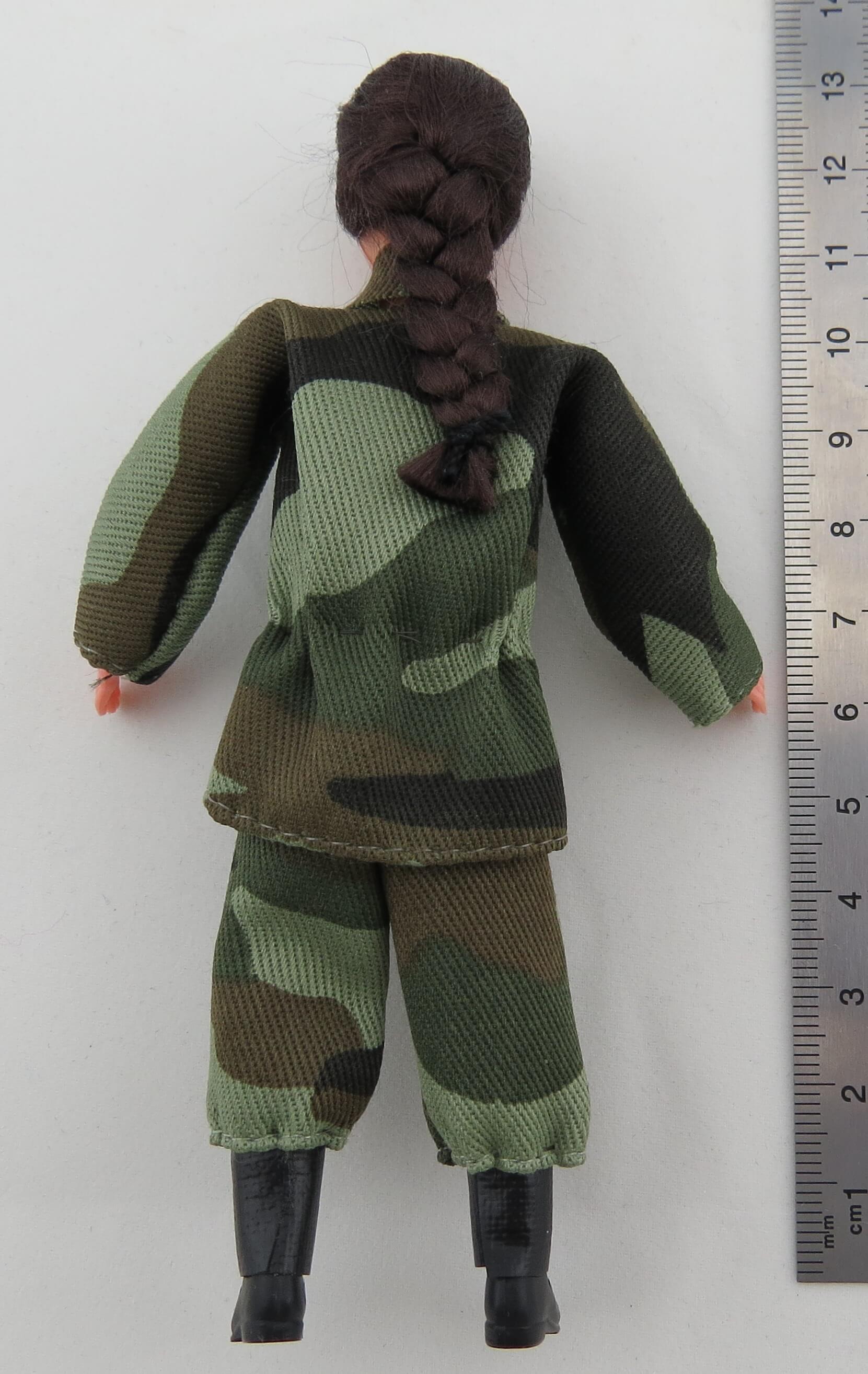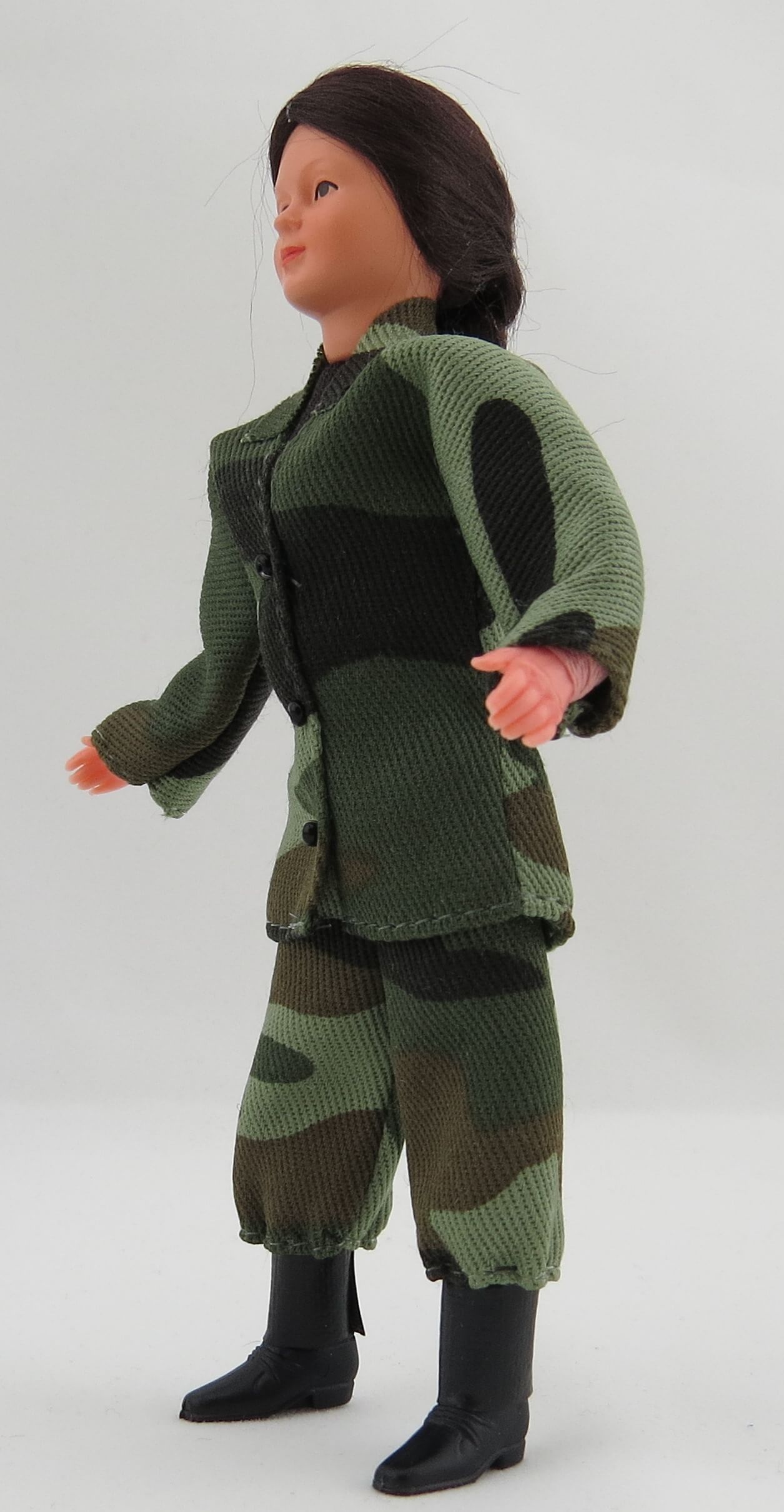 1x Biegepuppe FRAU ca. 13cm hoch mit dunklem langen Zopf, Stiefel, Armee-Bekleidung. Soldatin. Arme, Beine, Kopf können in fast jede Position gebogen werden.1x Biegepuppe FRAU ca. 13cm hoch mit dunklem langen Zopf, Stiefel, Armee-Bekleidung. Soldatin. Arme, Beine, Kopf können in fast jede Position gebogen werden.