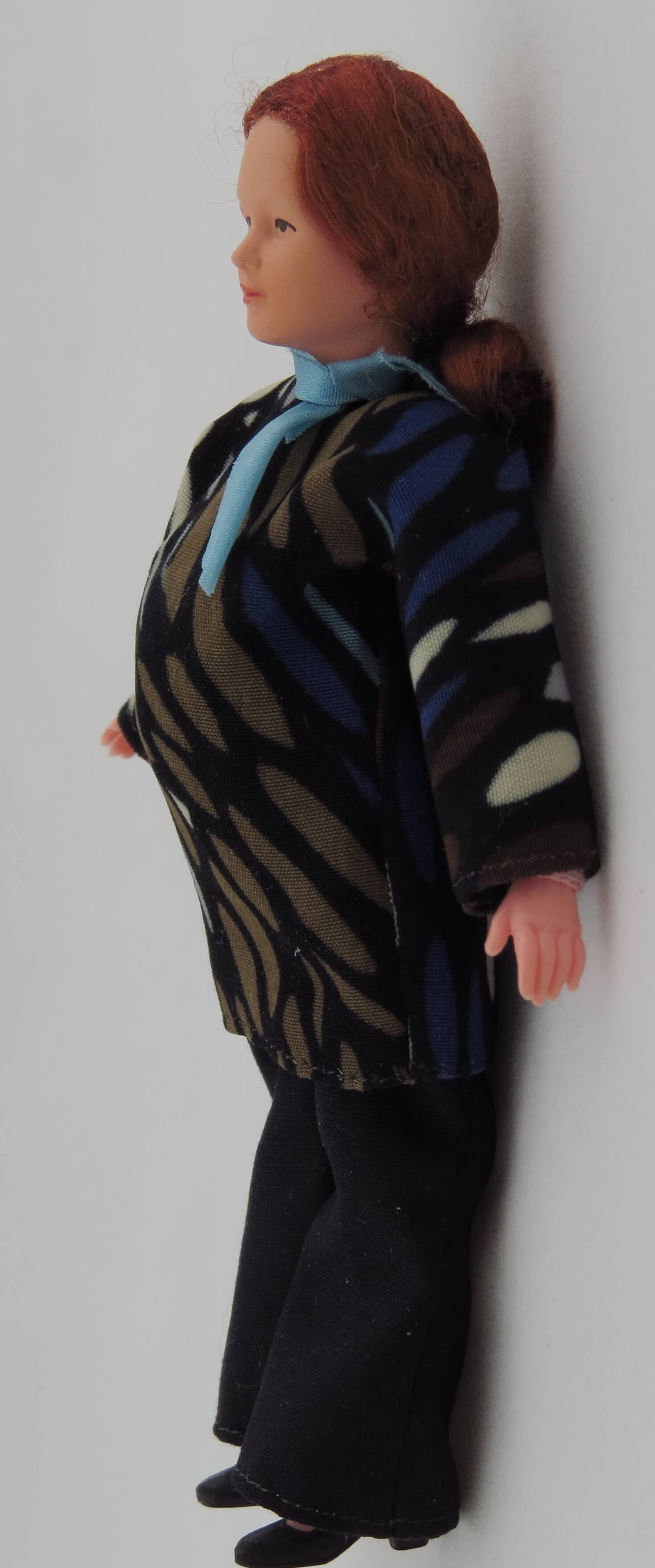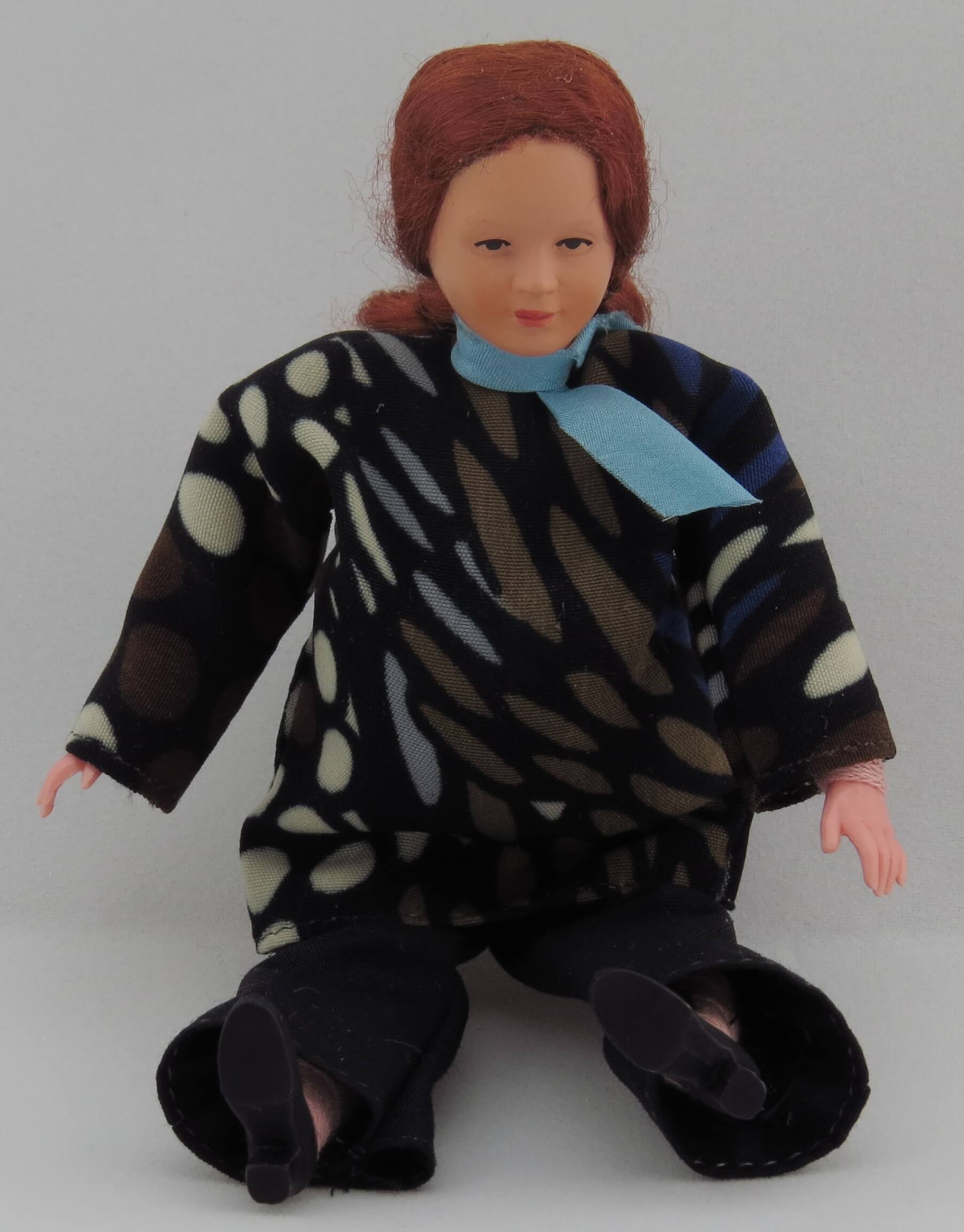 1x Biegepuppe FRAU ca. 13cm hoch mit buntem Kleid und schwarzer Hose. Schwangere, rote, geflochtene Haarfrisur ,Schal. Arme, Beine, Kopf können in fast jede Position gebogen werden.