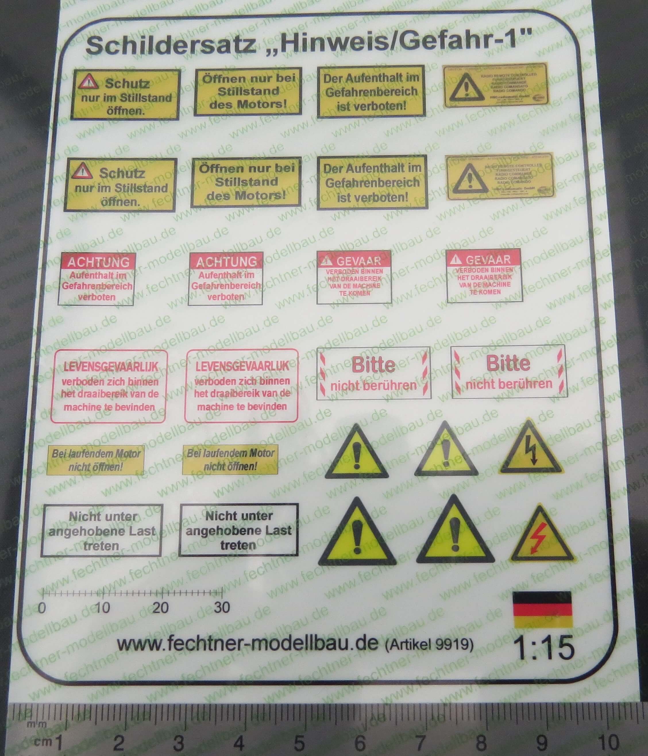 1x Decalbogen, Selbstklebefolie "Hinweis /Gefahr-1". Passend zu Maßstab 1:16 bis 1:14. Hochwertige Selbstklebefolie mit Schutzschicht, spritzwasserfest. Auch in anderen Maßstäben lieferbar!