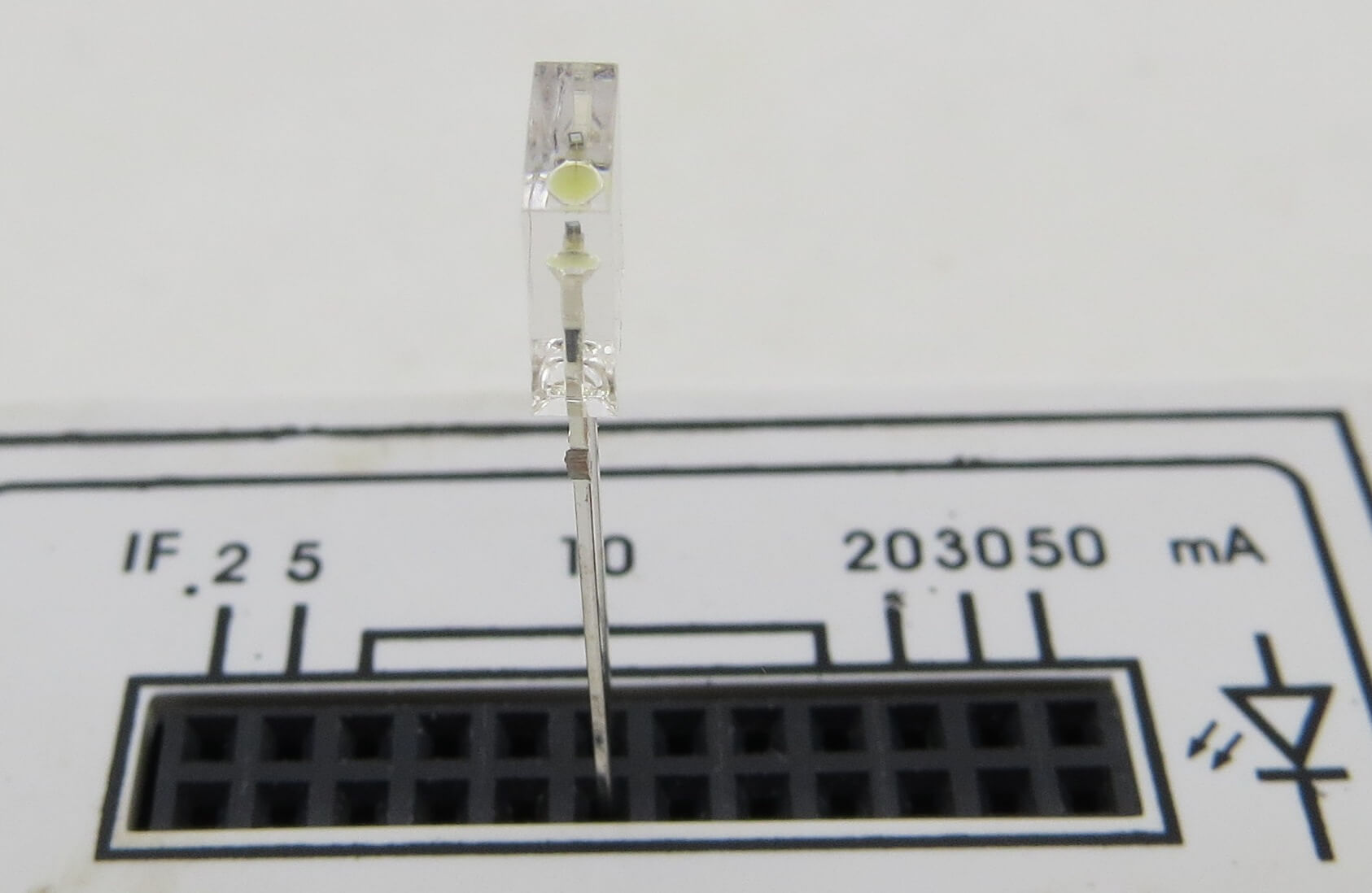 1x LED reinweiss 5x2, glasklares Gehäuse bedrahtet, rein-weiss. Rechteckig 5x2mm. Leuchtstärke: 5000 mcd. Farbe ca.6000K. Abstrahlwinkel: 120°. Für Betrieb an 4-19V ist KEIN Vorwiderstand notwendig!