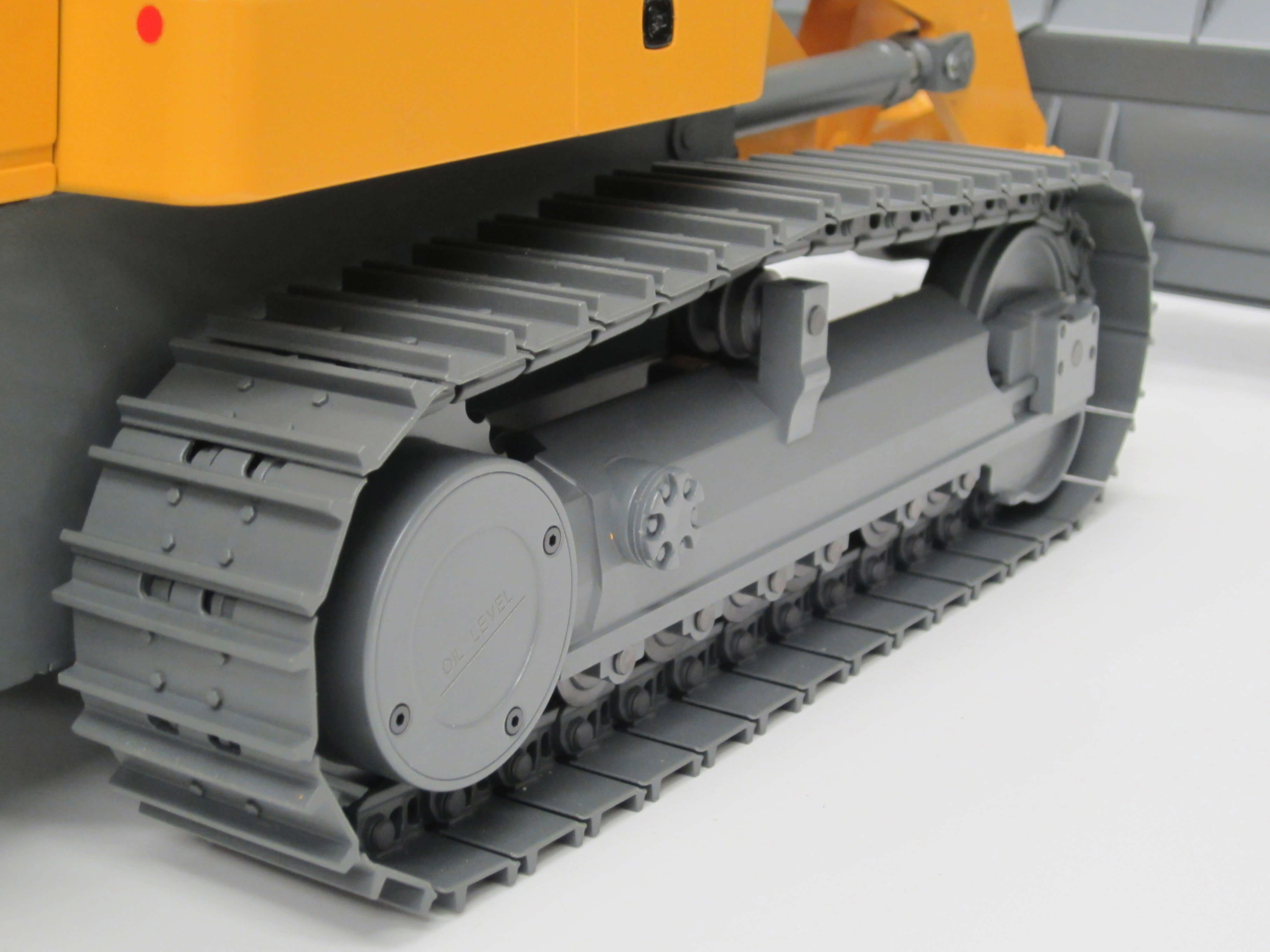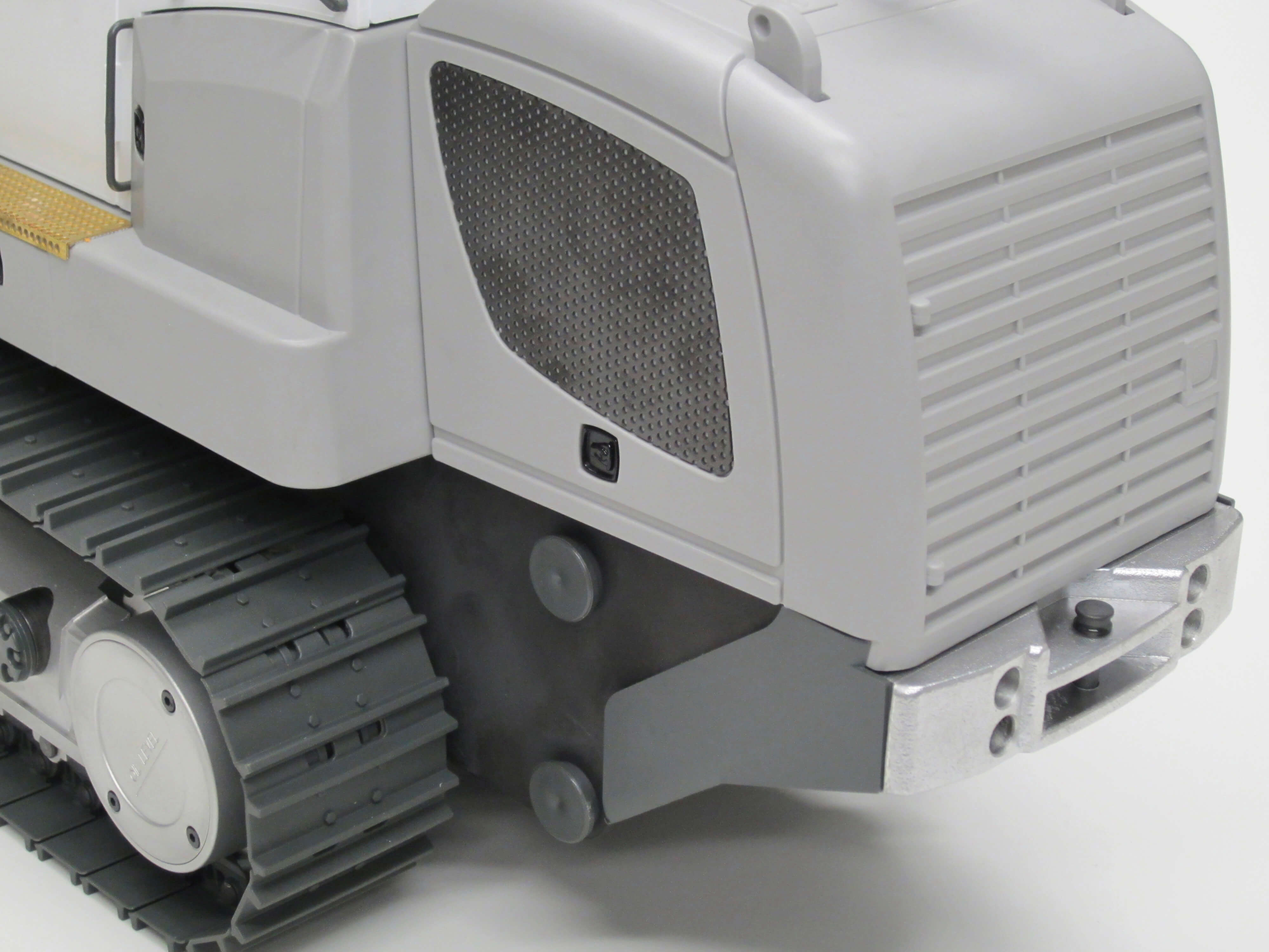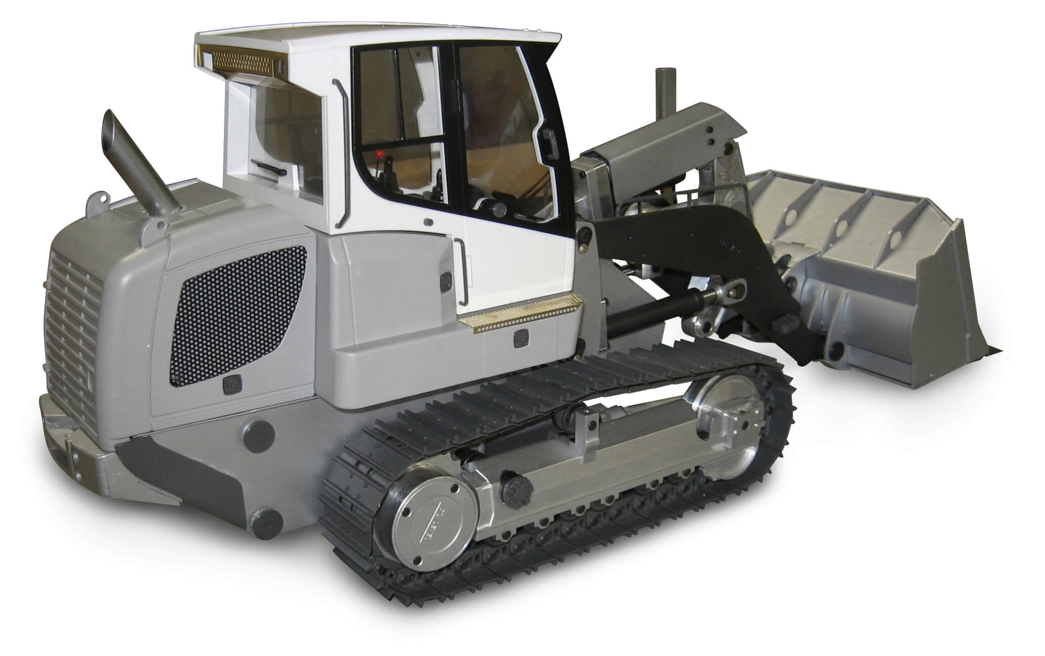 Laufwerk mit integriertem Kettenspanner für die Leitrolle. 2-Steg-Kette aus GFK. Stütz- und Leitrolle aus Stahl. Fahrerkabine und Innenausstattung, Beschlagteile.